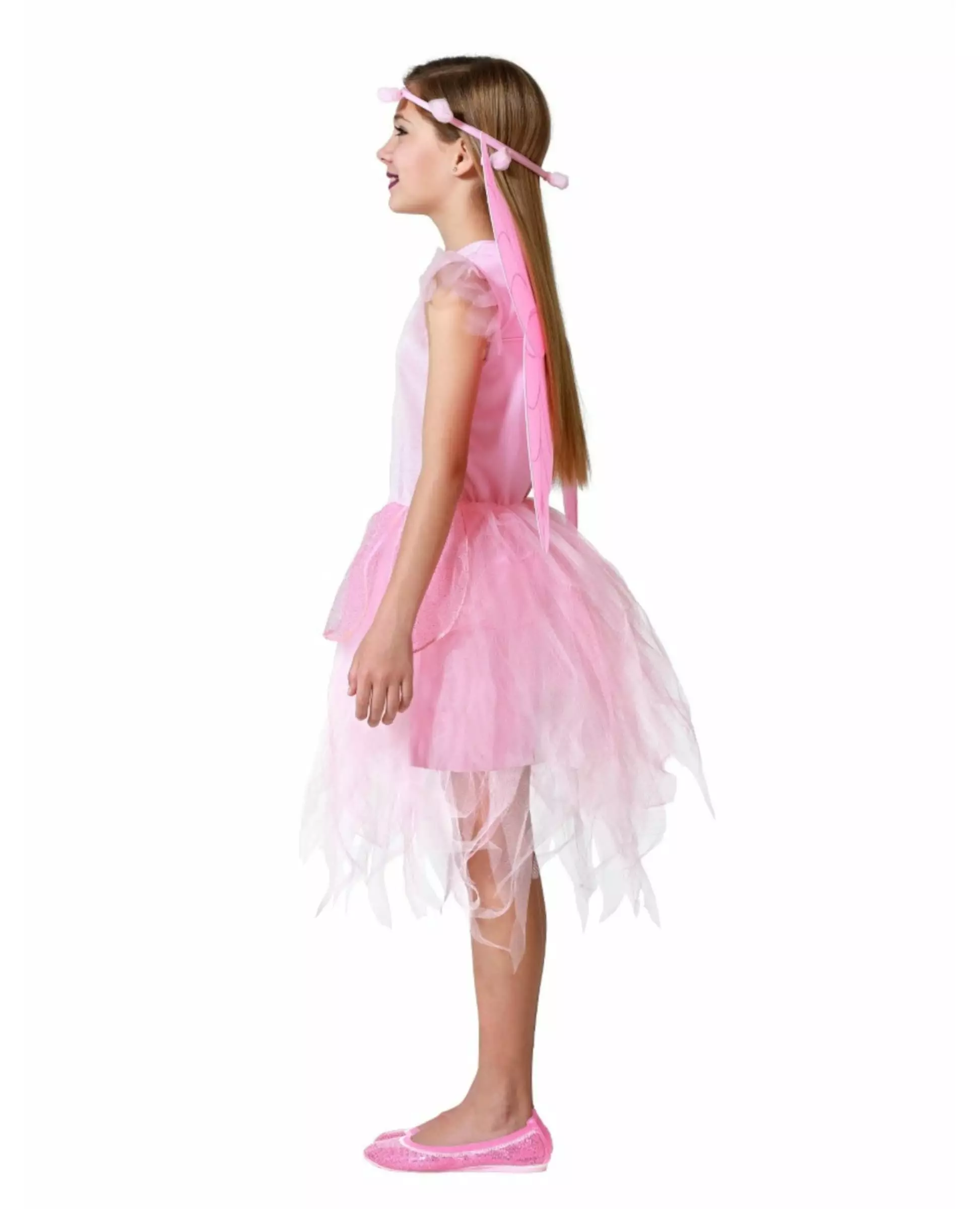 Så fin tyllkjole! Dette rosa fe-kostymet for jenter består av en kjole, et par vinger og en krone (trollstav og sko er ikke inkludert). Kjolen er lett i silkemykt stoff og er puffet ved skuldrene og skjørtet takket være et tylloverlegg. De matchende vingene er festet på ryggen. Kronen er lyserosa med fine stoffblomster på. Dette fe-kostymet for jenter vil være perfekt for å gjøre barnet ditt til den peneste feen på karnevalsdagen eller andre utkledningsarrangementer. Inkludert tilbehør: Kjole Vinger Krone Materiale: 100 % polyester Vedlikehold: Renseri