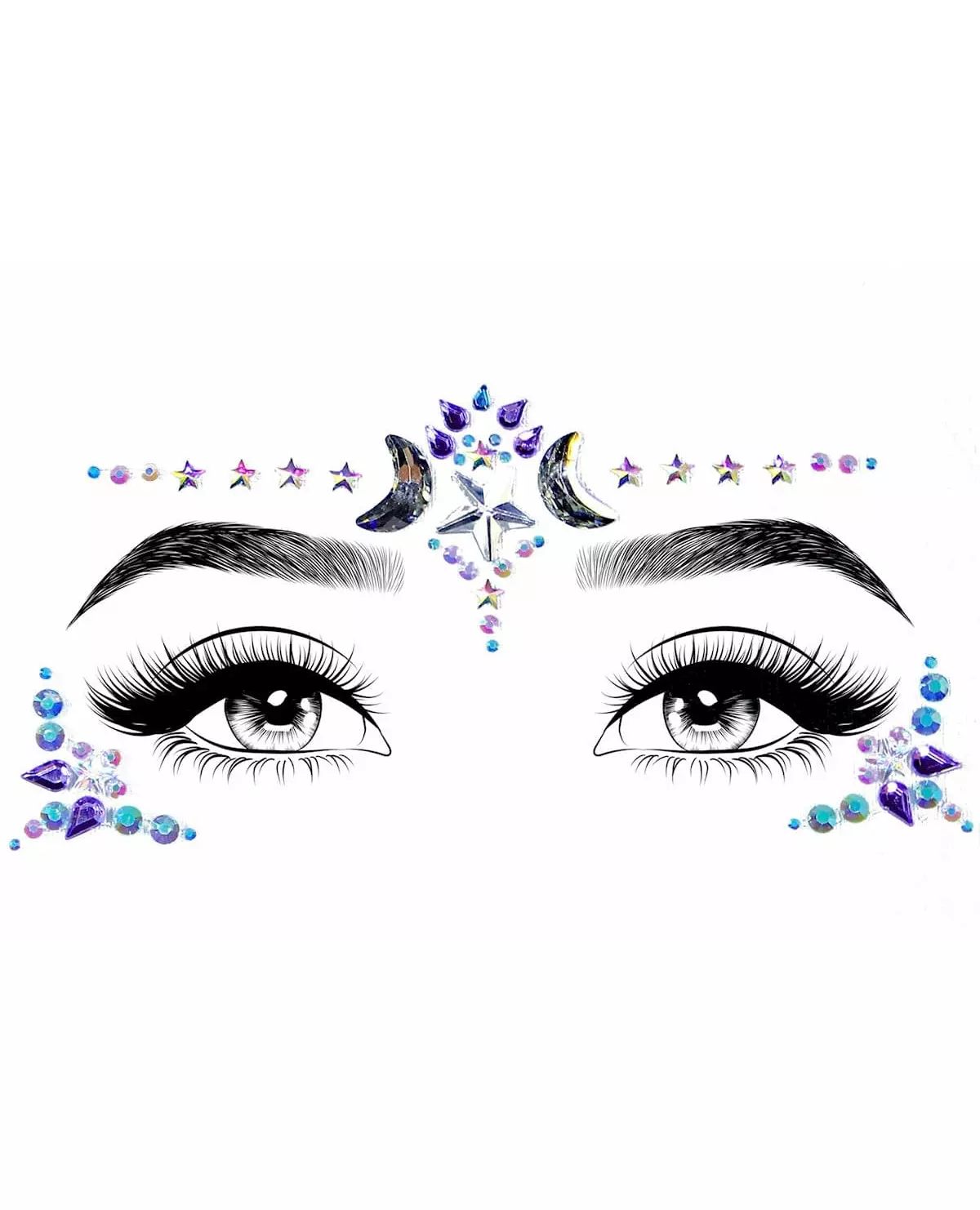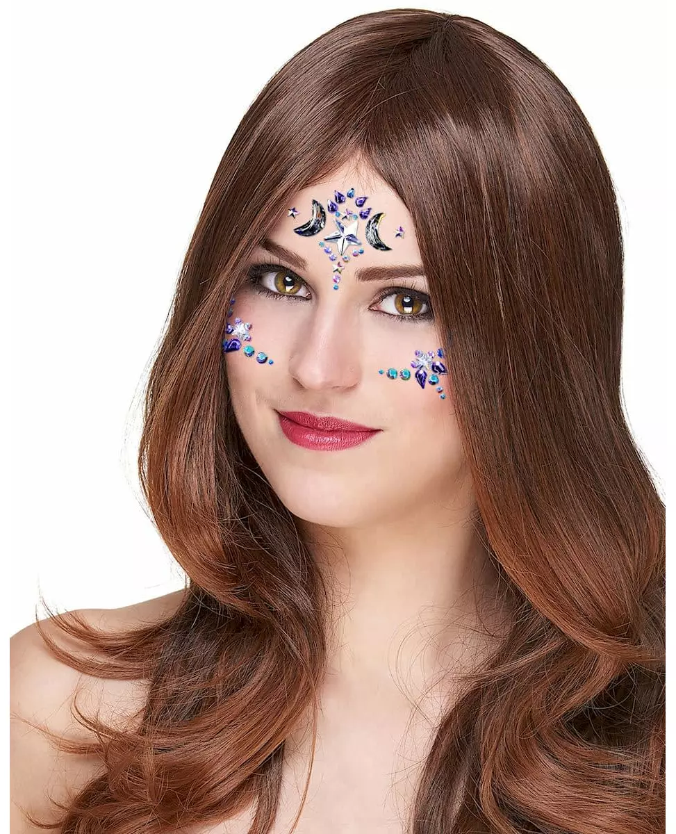 Lag utrolig sminke på et blunk. Disse ansiktssmykkene er selvklebende. De representerer stjerner, måner og andre strass-steiner, klare til å festes på ansiktet ditt. De vil være perfekte for å fullføre et fe-kostyme til karneval. Inkludert tilbehør: Ansiktssmykker