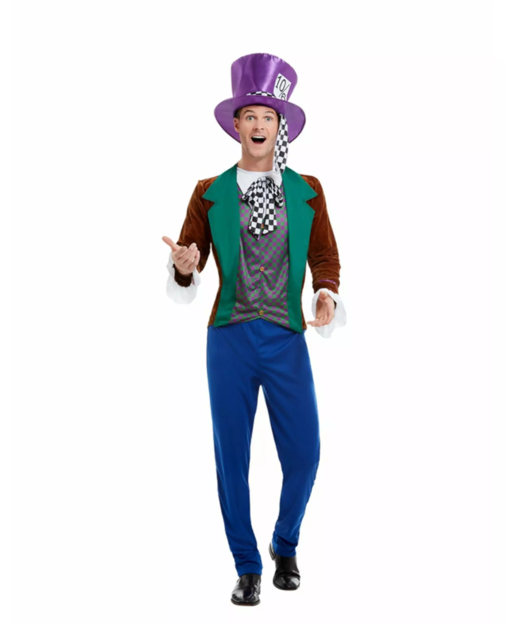 Feirer vi bursdag her i nærheten? Dette Mad Hatter-kostymet for menn består av en jakke, bukse og en hatt. Overdelen er en imitasjonsjakke med vest og falsk krage. Jakken er laget av brunt imitert fløyelsstoff med en flaskegrønn krage. En grønn og lilla rutete vest er sydd med jakken med et svart og hvitt rutete slips. Buksene er laget av blått stoff med elastisk linning. Til slutt er hatten laget av lilla satengstoff med matchende gallon til slipset og et spillkort. Dette eventyrbok-hattemakerkostymet vil være perfekt for en kostymefest med et eventyrkaraktertema. Inkludert tilbehør: Hatt, Jakke, Bukser Materiale: 100 % polyester Vedlikehold: Håndvask
