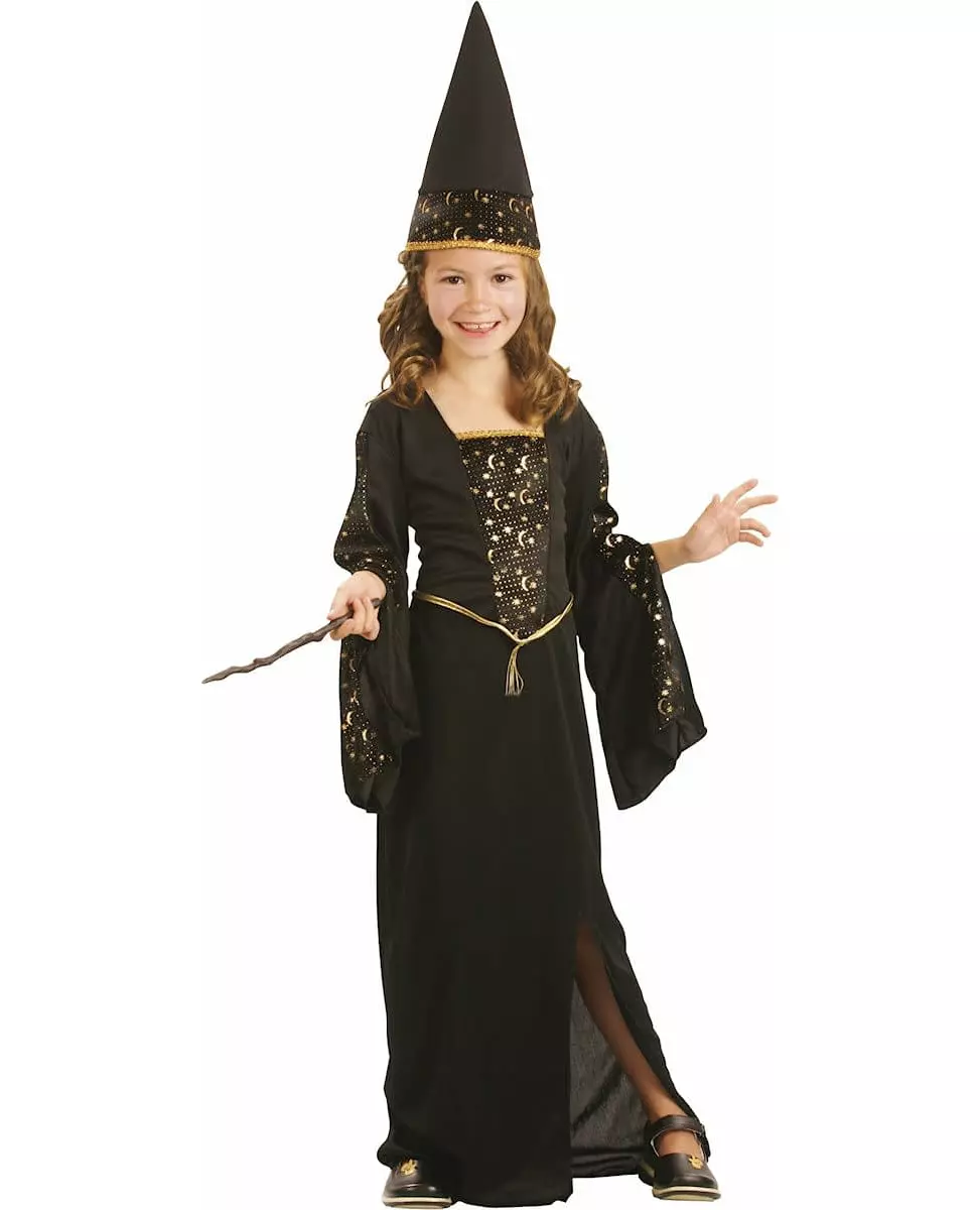 Knask eller knep! Dette barnekostymet har en heks. Det består av en kjole og en hatt (trollstav og sko er ikke inkludert). Den svarte kjolen er laget av polyester. De svært løse ermene er splittet ved albuen, slik at underarmene kan passere gjennom. Stoffet henger nedover armene. Et bånd med stjerner og måner er trykt fra skulderen til håndleddet. Dette mønsteret gjentas på brystet. Kragen er brodert i gull. Kjolen er splittet til kneet for å gi denne snille heksen et forførende utseende. Den spisse hatten er svart og matcher gulldekorasjonene på kjolen. Kle datteren din ut som en tryllekunstner til Halloween eller et show, slik at hun kan spille deg et puss. Inkludert tilbehør: Kleshatt Materiale: 100 % polyester Pleie: Håndvask
