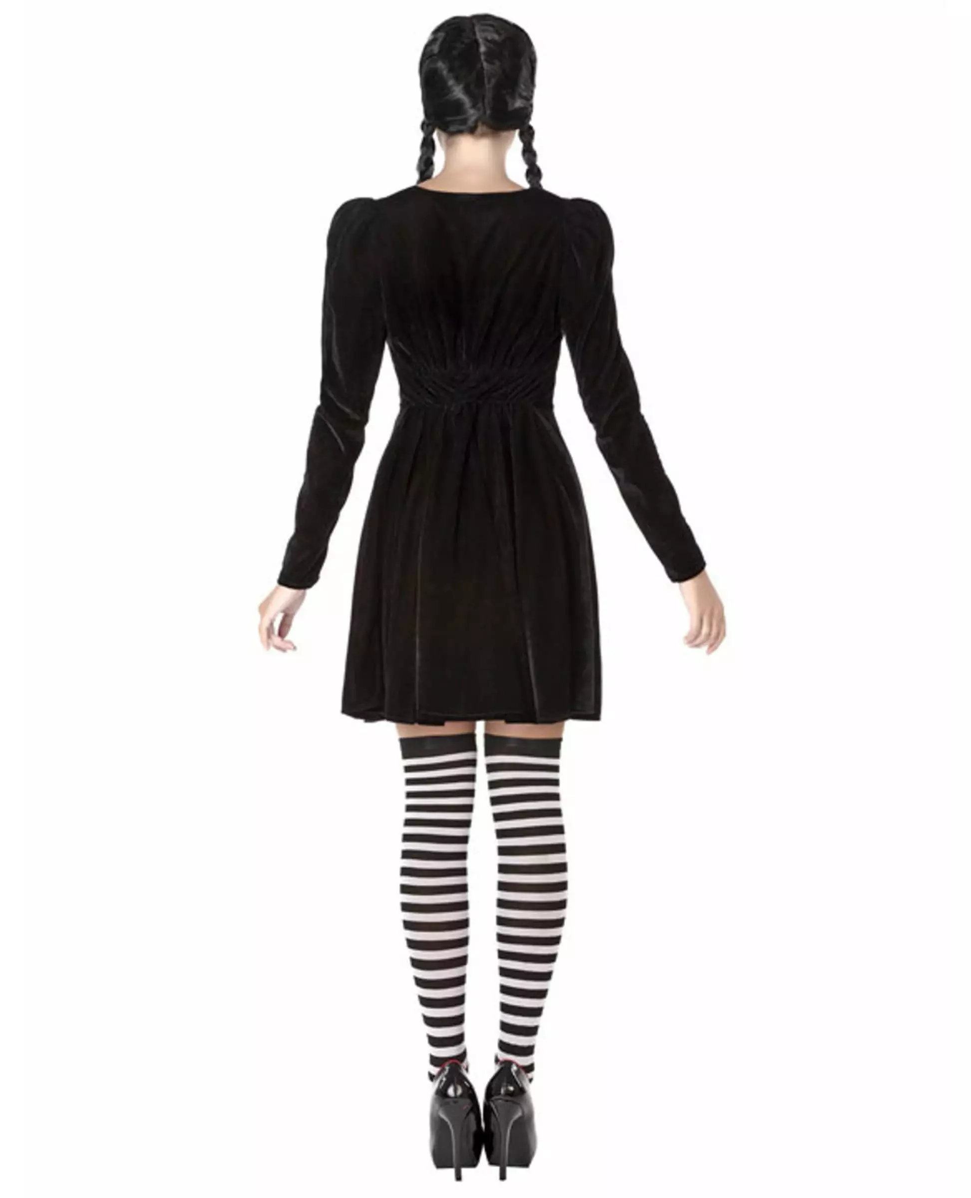 En berømt gotisk skolejente! Dette makabre skolejentekostymet er for kvinner og inkluderer en kjole, selges separat. Kjolen er laget av svart fløyelslignende stoff. Den har lange ermer. Kjolen er festet i midjen takket være en strikk bak, og den nederste delen av kjolen er luftig og utsvingt. En hvit Peter Pan-krage med to dekorative knapper passer til en gotisk skolejentestil. Denne skolejentekjolen i gotisk stil vil være perfekt til Halloween eller til en fest med skrekktema, eller til og med til en fest med en filmkarakter. Inkludert tilbehør: Kjole Materiale: 100 % polyester Vedlikehold: Håndvask