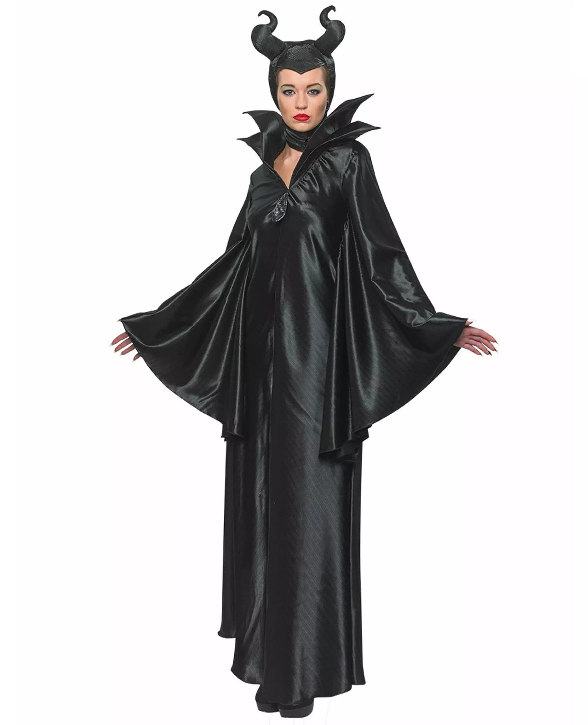Gå til den mørke siden i dette Maleficent-kostymet. Dette Maleficent-kostymet for kvinner er offisielt lisensiert av Disney. Det består av en kjole og et hodeplagg. Den lange kjolen er svart i et vakkert satengstoff med fine stripeeffekter. Den har store flaggermusermer. Den stive kragen danner store punkter på hver side av ansiktet. Et hodeplagg fullfører også dette Maleficent-kostymet. Laget av svart stoff, har det avrundede horn på toppen av hodet og lukkes under haken med borrelås. Dette Maleficent-kostymet vil være perfekt for å legemliggjøre denne berømte skurken fra tegnefilmen Tornerose til karnevalet. Inkludert tilbehør: Kjole Hodeplagg Materiale: 100 % polyester Stell: Håndvask Målinformasjon: For størrelse S, kjolen er ca. 134 cm lang og ermene ca. 66 cm lange. For størrelse M, kjolen er ca. 140 cm lang og ermene ca. 69 cm lange. For størrelse L, kjolen er ca. 140 cm lang.