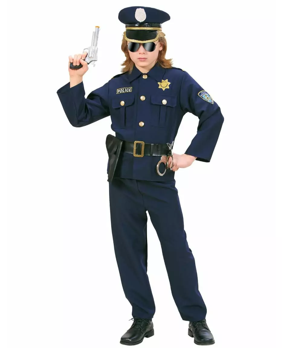 Med pistolholder inkludert! Dette politibetjentkostymet er for gutter. Det inkluderer en jakke og bukser. Den marineblå jakken har ordene «politi» og et flokket merke over brystlommene. Den har også politilogoen på den ene armen. Den lukkes med fire gullknapper. Buksene matcher antrekket. De har også en elastisk linning. Antrekket inkluderer også en matchende caps med et merketrykk. Dette kostymet vil være ideelt for karneval, et show eller andre utkledningsarrangementer.   ©copy; Widmann SRL. Tilbehør inkludert: Caps Jakke Bukser Belte/pistolholder Materiale: 100 % polyester Vedlikehold: Rens Målinformasjon: For størrelse 8/10 år, jakke ca. 52 cm lang, ermer ca. 50 cm lange, bukser ca. 86 cm lange og caps 52 cm i diameter.