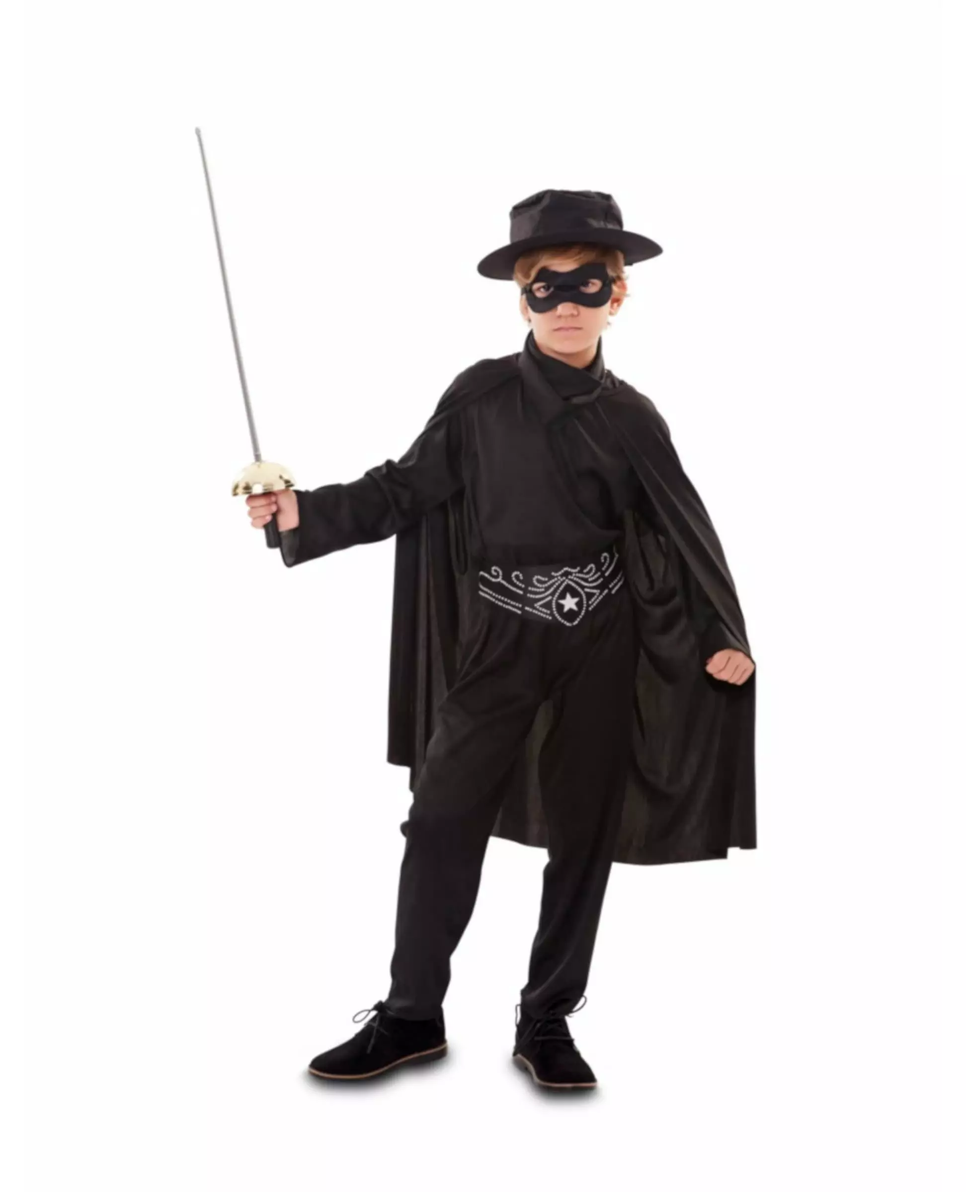 Maskert bandittkostyme for gutter. En mystisk borgervigilante. Dette maskerte bandittkostymet for gutter består av en jumpsuit, et belte, en kappe, en maske og en hatt (sverd ikke inkludert). Jumpsuiten er laget av et flagrende svart stoff for maksimal komfort. Barnekostymet inkluderer: Jumpsuit, belte, maske, kappe, hatt.