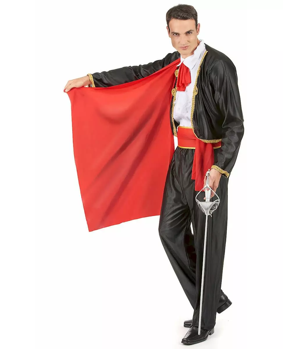 Olé! Dette matadorkostymet for menn består av en topp med kappe, et belte, bukser og en sløyfe (hvit skjorte og sko er ikke inkludert). Toppen er en skinnende svart jakke med gullflette og en rød kappe sydd på skulderen. Beltet er rødt med gullkanter på sidene. Det knytes enkelt bak. Buksene er skinnende svarte med en elastisk linning. Sløyfen er rød og glir rundt halsen takket være en elastisk strikk. Dette kostymet vil være perfekt for å legemliggjøre hovedpersonen i tyrefektingen på karnevalet eller for en temakveld. Inkludert tilbehør: Jakke Bukser Belte Sløyfe Materiale: 100 % polyester Vedlikehold: Håndvask
