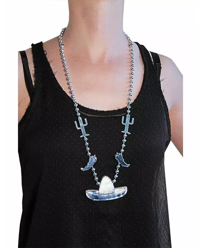 Halskjedet som setter Mexico rundt halsen din! Dette 80 cm lange halskjedet er ledsaget av ornamenter som hyller Mexico, som en sombrero, chilipepper og kaktus. Med sine sølvperler vil det gjøre forskjellen under dine livlige fester eller kostymefester. Bli med på Mexicana-fiesta nå!. Inkludert tilbehør: Halskjede