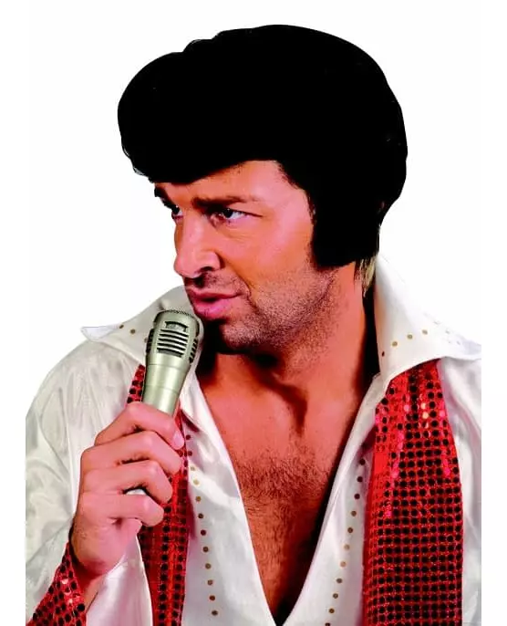 Legemliggjør kongen Denne rockestjerneparykken fra 50-tallet for menn vil få deg til å se ut som en rock 'n' roll-sanger. Det svarte håret er klippet relativt kort. Kindkjertene er tykke, og pannen er velfylt. Du kan style denne parykken for å danne en quiff verdig Kongen. Du er invitert til en fest med 50-/60-tallstema, og du vil vise frem sangtalentene dine. Forvandle deg til en rockestjerne! Inkludert tilbehør: Parykk. Materiale: 100 % polyester.