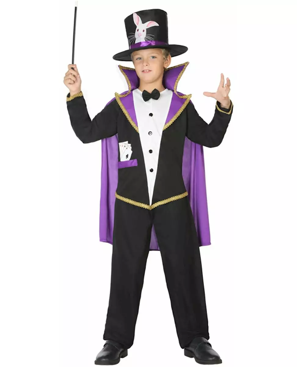 En tryllekunstner med eksepsjonelt talent! Dette tryllekunstnerkostymet for barn inkluderer en hatt, en kappe, en T-skjorte og bukser (tavle og sko er ikke inkludert). T-skjorten har borrelås bak halsen. Den er dekorert med gullkant nederst, på kragen og på ermene. Denne T-skjorten imiterer en jakke og avslører en hvit skjorte med sløyfe og svarte knapper. Den har en falsk lomme og et spillkorttrykk. Kappen festes til T-skjorten med borrelås. Den er lilla med en stiv krage omgitt av gullkant. Buksene er laget av komfortabelt svart stoff og har en elastisk linning. Flosshatten har en ramme for å bevare formen. Den er dekorert med et lilla bånd og et kanintrykk. La barnet ditt fly bort til en magisk verden for et show eller karneval i dette vakre tryllekunstnerkostymet. Inkludert tilbehør: Kappe T-skjorte Bukser Hatt Materiale: 100 % polyester Vedlikehold: Håndvask Målinformasjon: Kappe: 70 cm størrelse 5/6 år