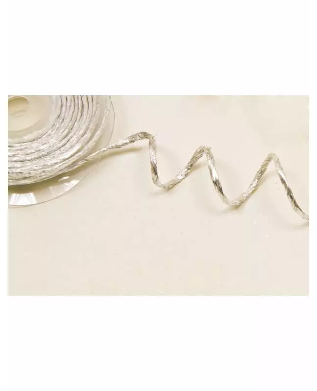 Dette metalliske sølvfargede raffiabåndet har en tråd i midten som gjør at det kan vris og dermed gi det en original form. Det måler omtrent 5 m i lengden. Denne raffiaen vil være perfekt for å dekorere bordet eller gavepakker, eller for å lage flotte serviettringer.