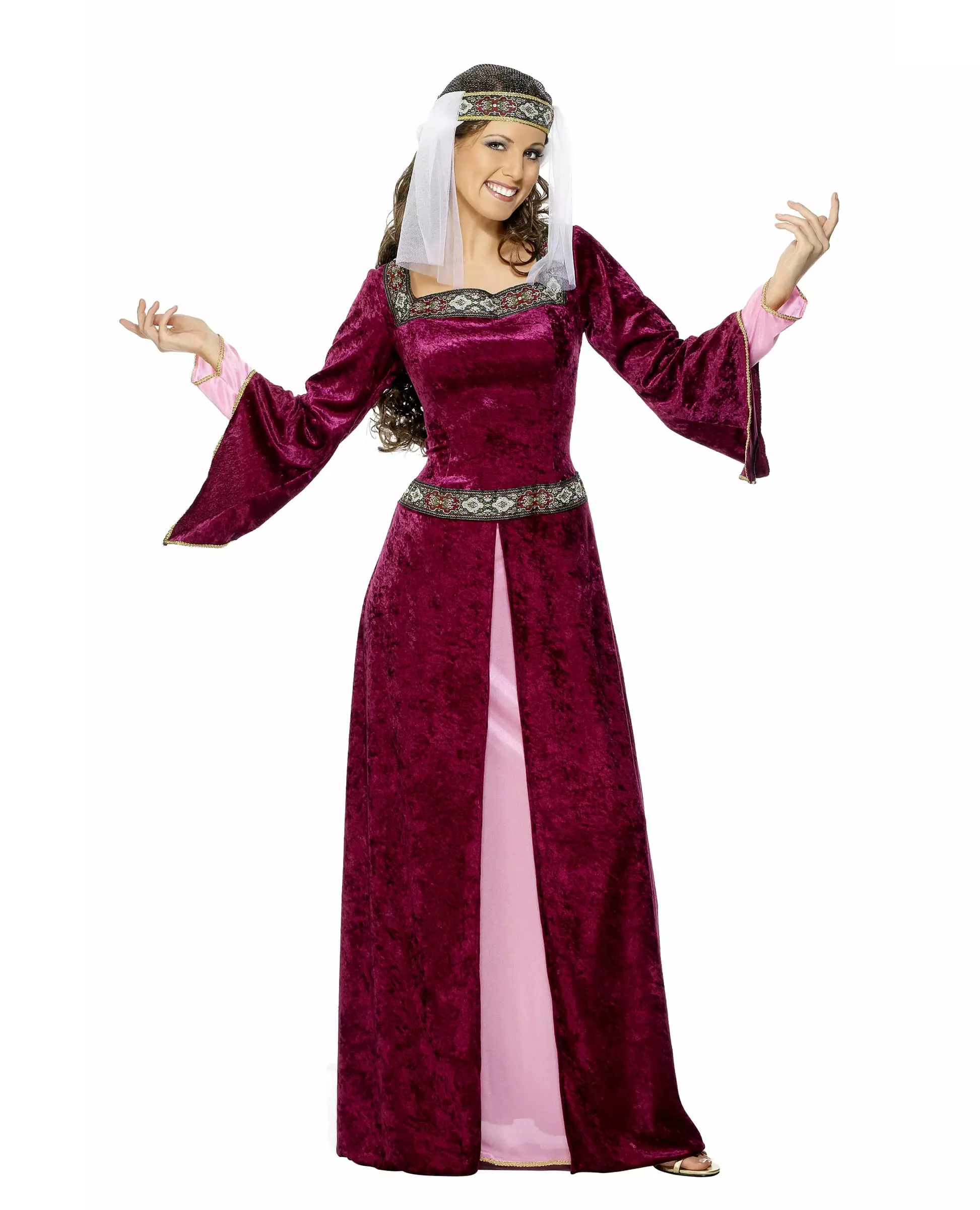 En ekstremt komfortabel kjole! Dette middelalderdronningkostymet for kvinner består av en lang kjole og et pannebånd. Kjolen har et fløyelsutseende og er veldig komfortabel. Kragen og midjen er definert av to vakre bånd med broderte mønstre, og endene av ermene er utsmykket med fin forgylling. En elastisk del bak og to snorer gjør at kjolen kan strammes i midjen og gi den en tettsittende effekt. Pannebåndet glir på som en hatt, siden det er laget av sølvnetting. To hvite slør er sydd på hver side. Det er lite i størrelsen. Dette kostymet er perfekt for å spille en ekte middelalderdronning på utkledningsfestene dine, det vil definitivt ta deg tilbake til slottstiden!. Inkludert tilbehør: Pannebånd til kjole Materiale: 100 % polyester Stell: For hånd Målinformasjon: For størrelse Large måler kjolen 140 cm lang.