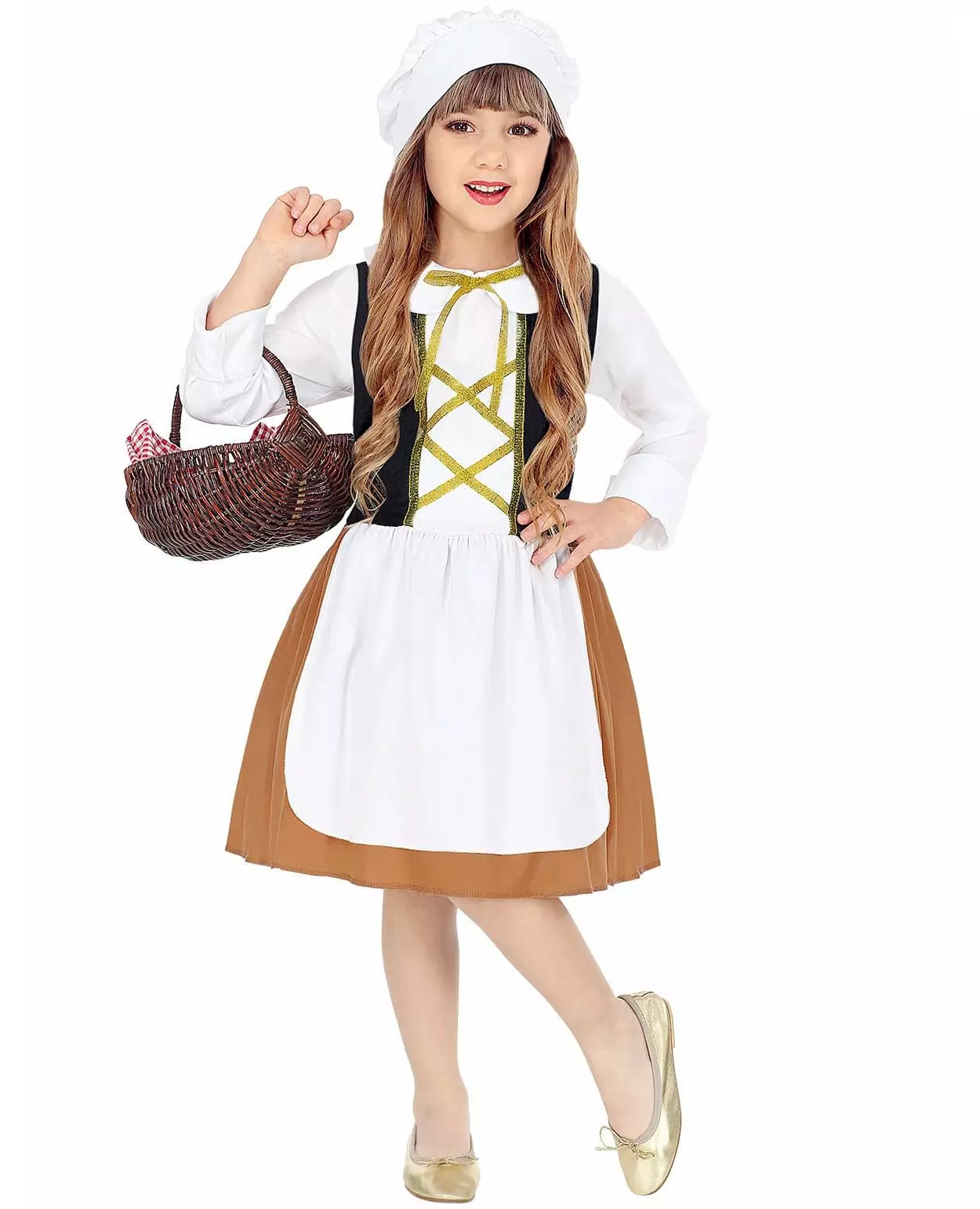 Perfekt for en middelalderkveld. Dette middelalderpikekostymet for jenter består av en kjole og et hodeplagg (kurv ikke inkludert). Hodeplagget er typisk for middelalderhodeplagg. Det er hvitt og dekker toppen av hodet. Kjolen imiterer en hvit bluse med lange ermer hvor en vest og en falsk blonde er sydd. Nederdelen av kjolen imiterer et beige skjørt med et hvitt forkle over. Med dette kostymet vil datteren din legemliggjøre en pen liten middelalderpike under karnevalet eller til en middelalderkostymefest. Inkludert tilbehør: Kjolepannebånd Materiale: 100 % polyester