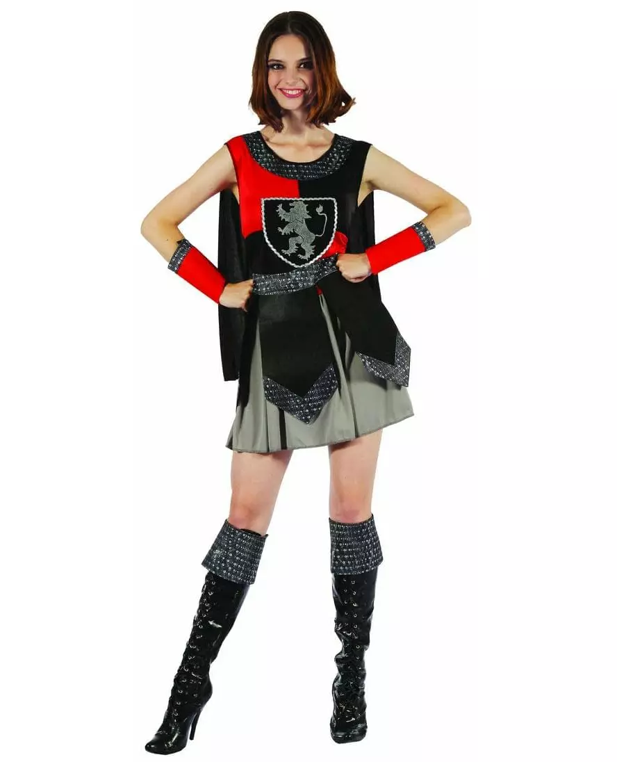Vinn en enkeltkamp Dette middelalderske ridderkostymet for kvinner inkluderer en kjole med kappe, belte, ermer og støveltrekk (sko ikke inkludert). Kjolen er ermeløs og lukkes i halsen med blonder. Toppen har fire store svarte og røde firkanter. Den runde halsen er sydd med et lærtrykket stoff med små nagler. Et merke er sydd på brystet som forestiller en sølvløve. Underskjørtet er grått og tynt. Et belte kan plasseres i livet for å simulere rustning. Strimler av svart stoff er ferdig med naglete tupper. Røde ermer skal bæres på håndleddene. De lukkes med borrelås. En påminnelse om knottene er tilstede i den ene enden av mansjettene. Støveltrekk med læreffekt kan festes med borrelås over støvler, for eksempel, for å lage en naglete mansjett. For en middelaldertema-kveld, bruk dette kostymet av en soldat som forsvarer ære. Inkludert tilbehør: Kjole med kappe Belte 2 ermer 2 støveltrekk Materiale: 100 % polyester Pleie: Håndvask