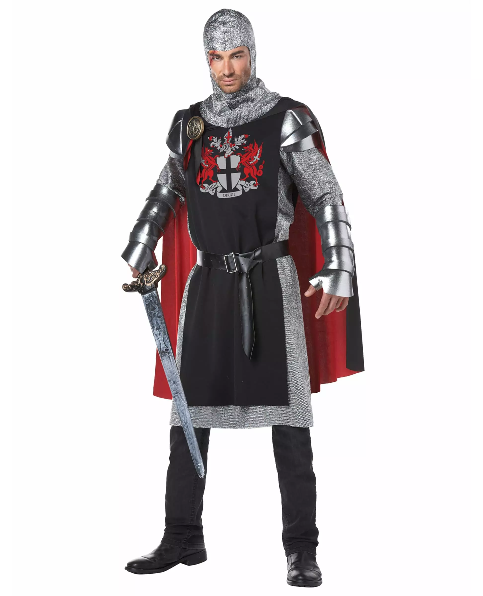 Legemliggjør en modig ridder til en utkledningsfest! Dette middelalderridderkostymet er for menn. Det består av en tunika med ermer, en kappe, en medaljong, en hette, et par hansker og et belte (bukser, sverd og sko er ikke inkludert). Tunikaen er svart. Et grått og svart våpenskjold er trykt foran. Ermene er lange og har sølvfarget ringbrynjeeffekt. Skuldrene er laget av skum, noe som gir en illusjon av rustning. Kappen er laget av tykt svart og rødt stoff. Den måler omtrent 95 cm og kan enkelt knytes rundt halsen med to bånd. Grå skumhansker er også inkludert, og et belte med læreffekt lar deg justere antrekket til din størrelse. Til slutt vil en hette med ringbrynjeeffekt og en gyllen medaljong sette prikken over i-en på dette antrekket. Dette kostymet vil være perfekt for å forvandle deg til en middelalderridder under utkledningsfestene dine. Inkludert tilbehør: Tunika, kappe, medaljong, hette, 2 hansker, belte. Materiale: 100 % polyester. Vedlikehold: Håndvask.