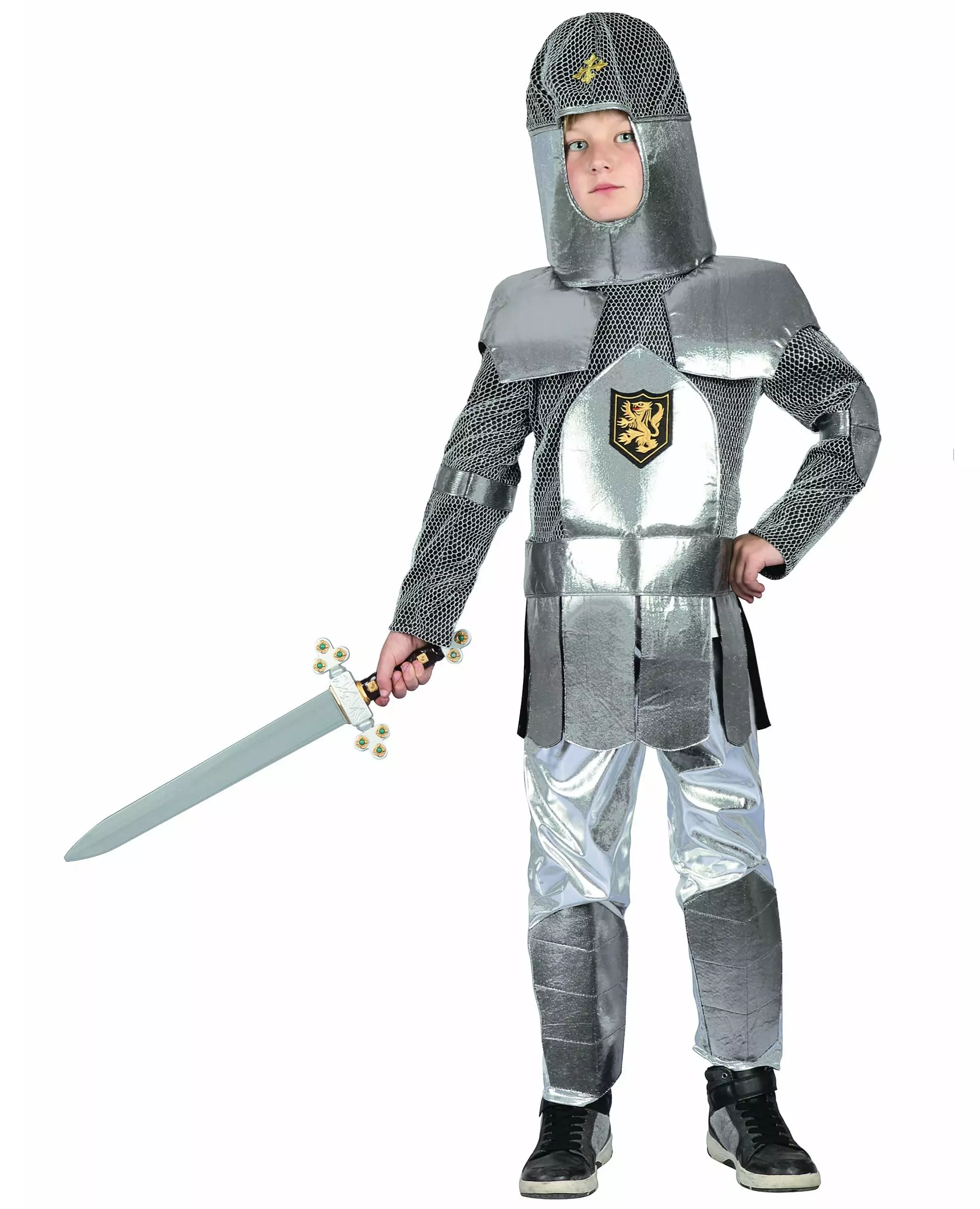 For en kjekk ridder! Dette ridderkostymet i rustning for barn inkluderer en topp, bukser og en hjelm (sverd og sko er ikke inkludert). Den langermede toppen, laget av imitert ringbrynje, er helt i sølv. Myke skumbrystplater dekorerer skuldrene og brystet. Buksene er fleksible og har tykkere leggings som dekker leggene. Til slutt vil hjelmen, som imiterer rustning og ringbrynje, sitte komfortabelt på hodet. Den er åpen i ansiktet. Dette ridderkostymet i rustning for gutter er svært komplett for å legemliggjøre en symbolsk karakter fra middelalderen under karnevalet. Inkludert tilbehør: Topp Bukser Hjelm Materiale: 100 % polyester Vedlikehold: Håndvask