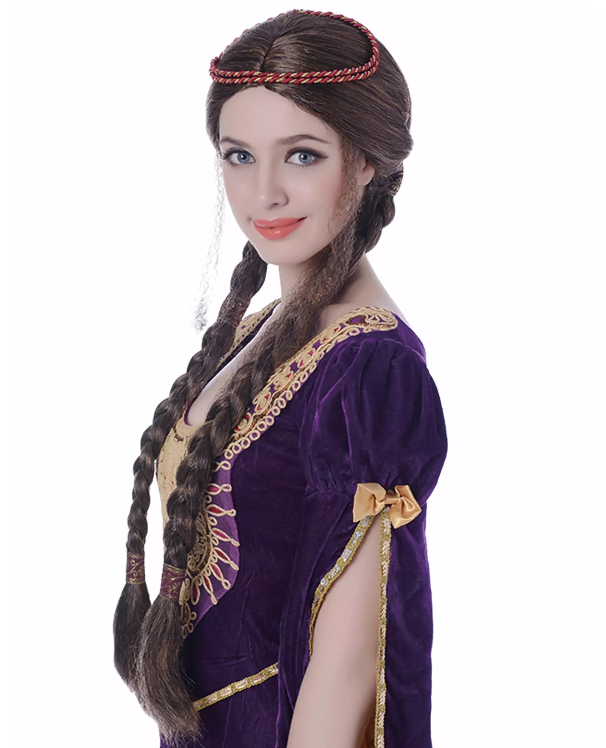 Reis tilbake i tid med denne middelalderparykken! Denne middelalderparykken er for kvinner. Den er laget av syntetisk brunt hår med røde striper. De er bundet i pene fletter som måler omtrent 62 cm. Disse er dekorert med burgunderrøde bånd med gullmønstre. Deler med krøllete hår er også tilstede på hver side av hodet. Til slutt setter et matchende hodeplagg prikken over i-en. Denne parykken vil være perfekt for å fullføre kostymene dine under middelalderkveldene dine. Inkludert tilbehør: Parykk med hodeplagg Materiale: Syntetisk 100 % polyester 100 % polyester