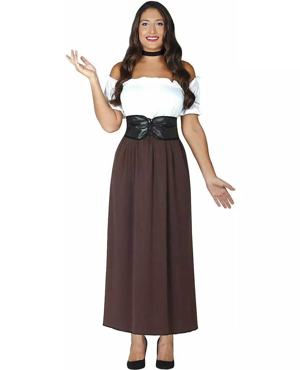 På den pranglende ponni-kroen! Dette vertshusholderkostymet består av en kjole og et belte. Den lange kjolen er hvit på toppen og brun på bunnen, med en båthals som pent avslører skuldrene. Et bredt svart belte med blonder fremhever midjen. Dette vertshusholderkostymet vil være perfekt hvis du vil delta på et middelalderarrangement, et karneval eller en kostymefest med middelaldertema. Inkludert tilbehør: Kjole Belte Materiale: 100 % polyester Stell: Håndvask