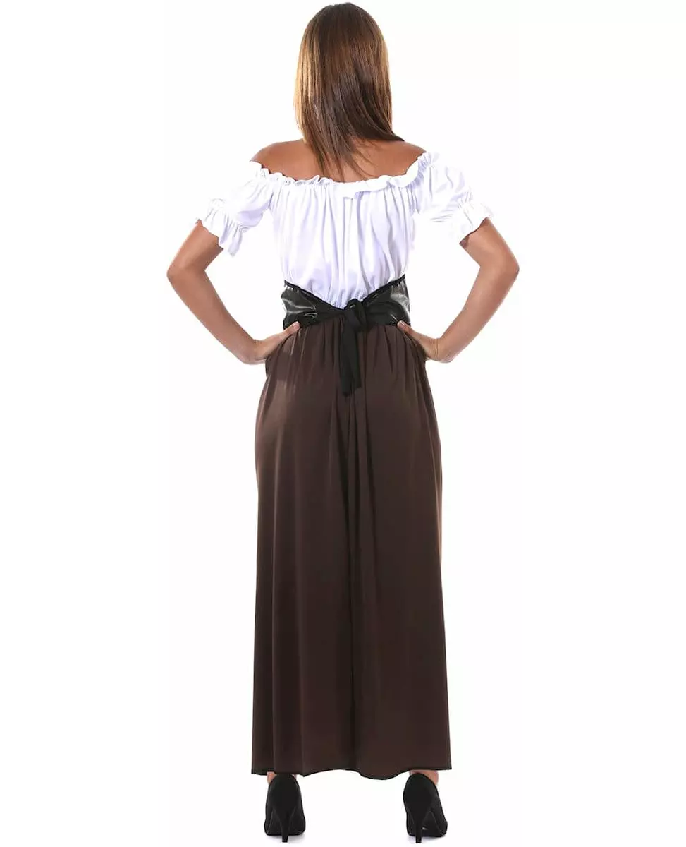 På den pranglende ponni-kroen! Dette vertshusholderkostymet består av en kjole og et belte. Den lange kjolen er hvit på toppen og brun på bunnen, med en båthals som pent avslører skuldrene. Et bredt svart belte med blonder fremhever midjen. Dette vertshusholderkostymet vil være perfekt hvis du vil delta på et middelalderarrangement, et karneval eller en kostymefest med middelaldertema. Inkludert tilbehør: Kjole Belte Materiale: 100 % polyester Stell: Håndvask