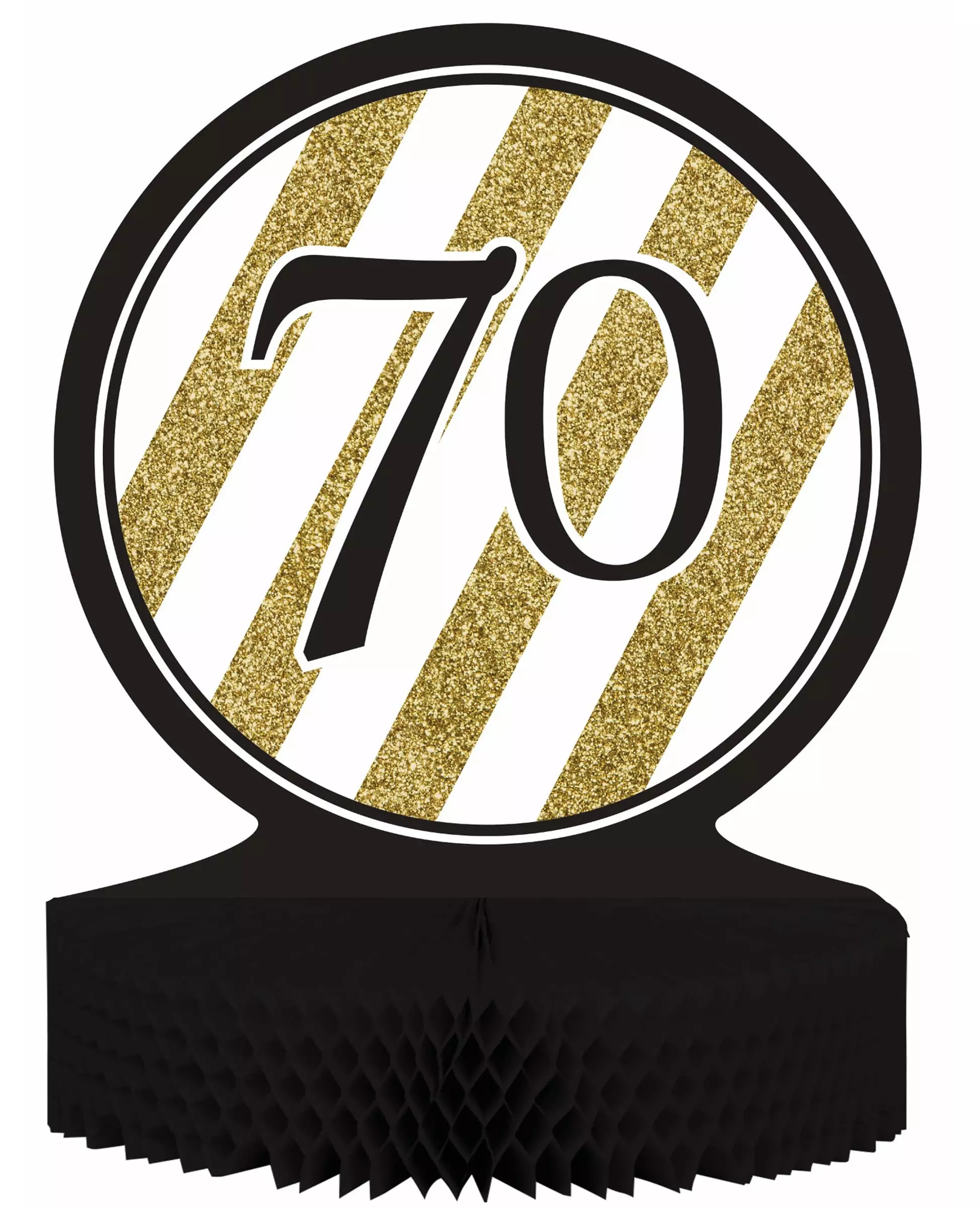 Middepunktsdekorasjon i honningkakepapir, 70 år, svart og gull, 23 x 30 cm. En stilig bursdagsdekorasjon i gull til 70-årsdagen din. Denne dekorasjonen er et midtpunktsdekorasjon til bursdagen.