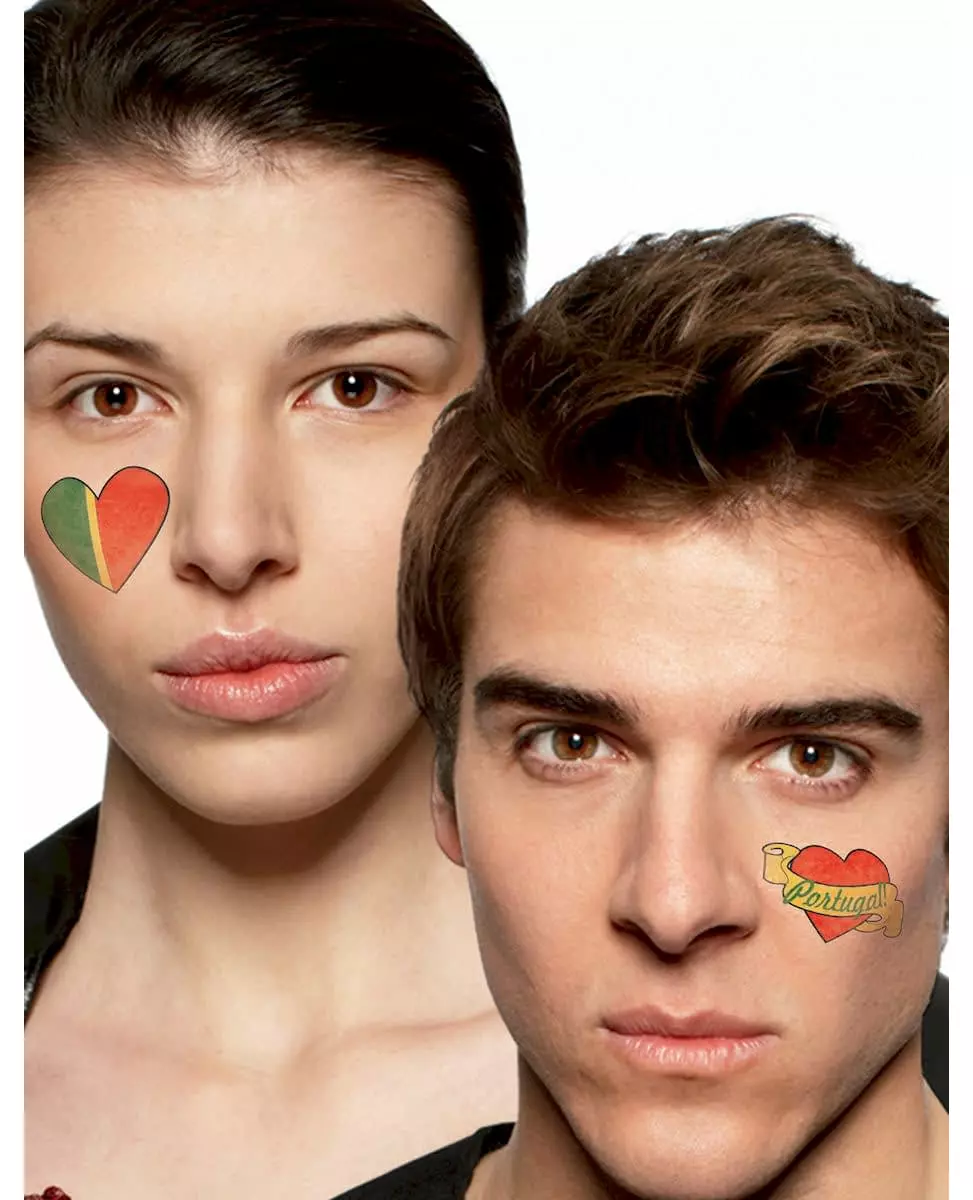 Støtt ditt portugisiske lag! Dette settet inneholder et ark med midlertidige portugisiske supportertatoveringer. Du finner flere tatoveringsdesign i fargene til det berømte portugisiske flagget, som hjerter, fotballdrakter og annet. Fullfør supporterantrekket ditt for et sportsarrangement under VM eller EM! Ingredienser: Akrylpolymer (2-propensyre, 2-metyl-, butylester, polymer med metyl 2-metyl-2-propenoat), sukker (SAIB), oksydipropyldibenzoat, PET-utløserfilm, syntetisk voks, hvit mineralolje, polyoksymetylenmelamin, soyabønneolje, titandioksid, jernoksider, blå 1 innsjø, gul 5 innsjø, rød 7 innsjø, svart pulver. Inkludert tilbehør: Tatoveringer Materiale: Akrylpolymer (2-propensyre, 2-metyl-, butylester, polymer med metyl-2-metyl-2-propenoat), sukker (SAIB), oksydipropyldibenzoat, PET-slippfilm, syntetisk voks, hvit mineralolje, polyoksymetylenmelamin, soyabønneolje, titandioksid, jern