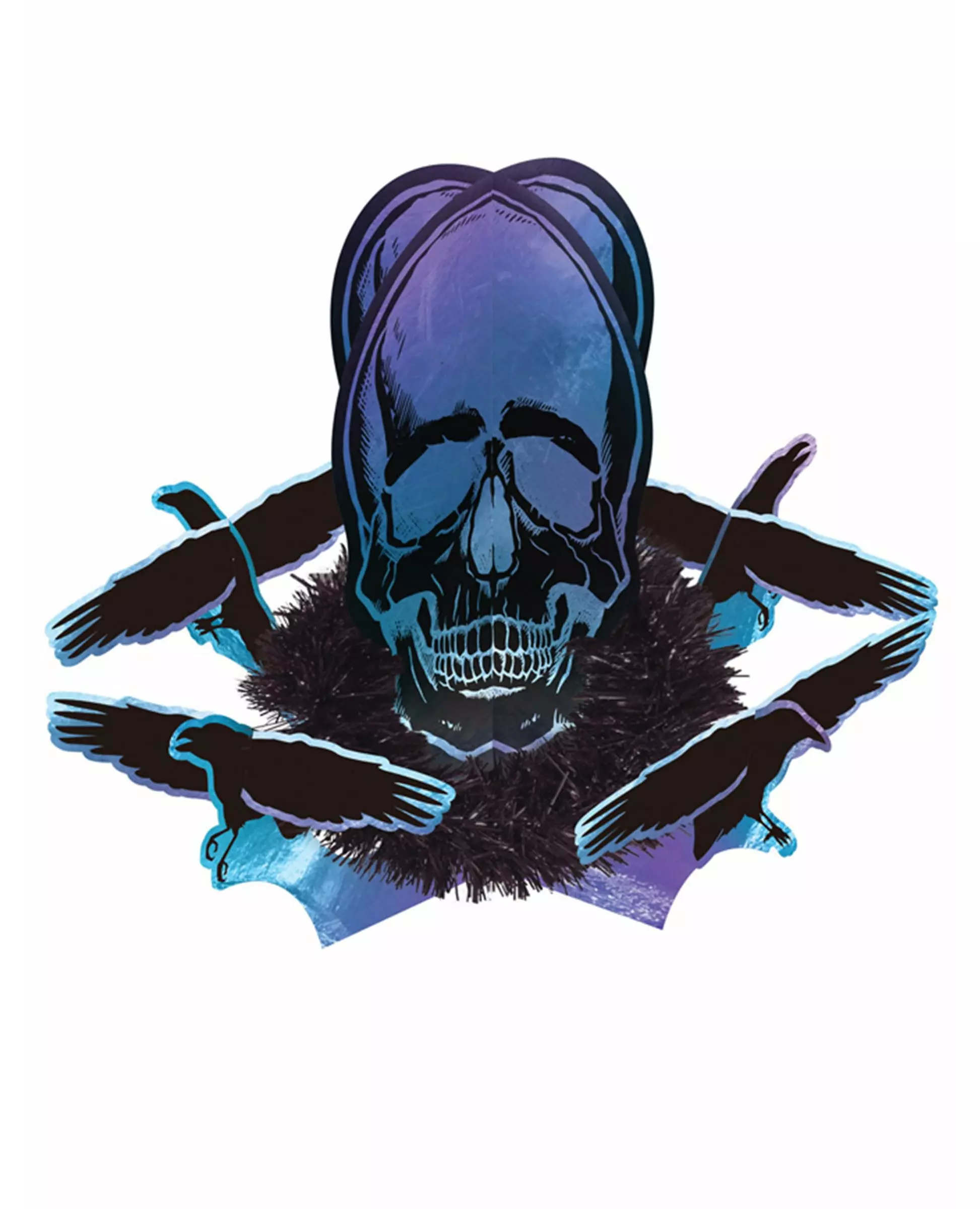 Et originalt midtpunkt! Dette Boneshine Fever-midtpunktet måler omtrent 35 x 27 cm. Basen er blå med lilla fargetoner og er dekorert med et kråkereir. Senteret er dekorert med en blå og lilla hodeskalle omgitt av forskjellige svarte kråker. Dette Boneshine Fever-midtpunktet vil være perfekt for å fullføre Halloween-borddekorasjonen din! Materiale: nei. Inkludert tilbehør: 1 midtpunkt
