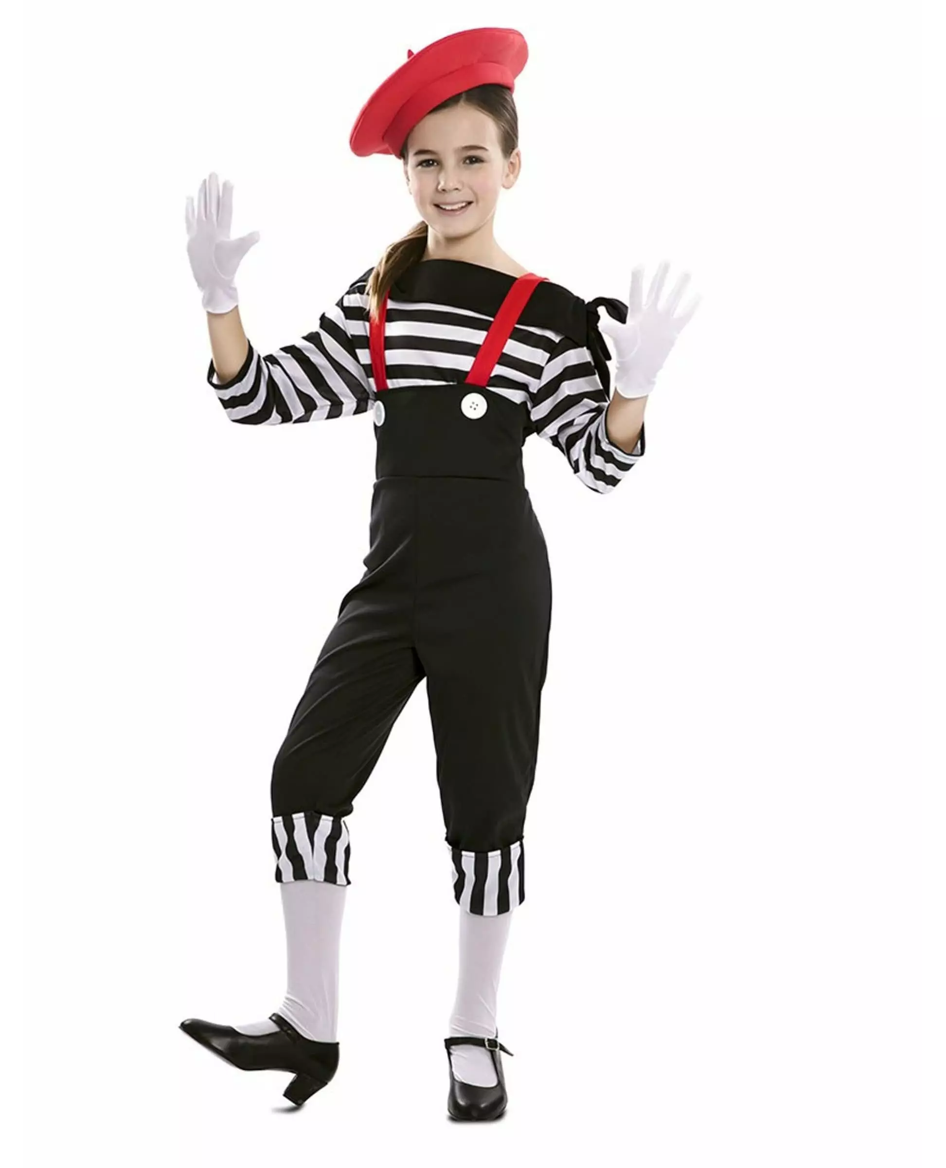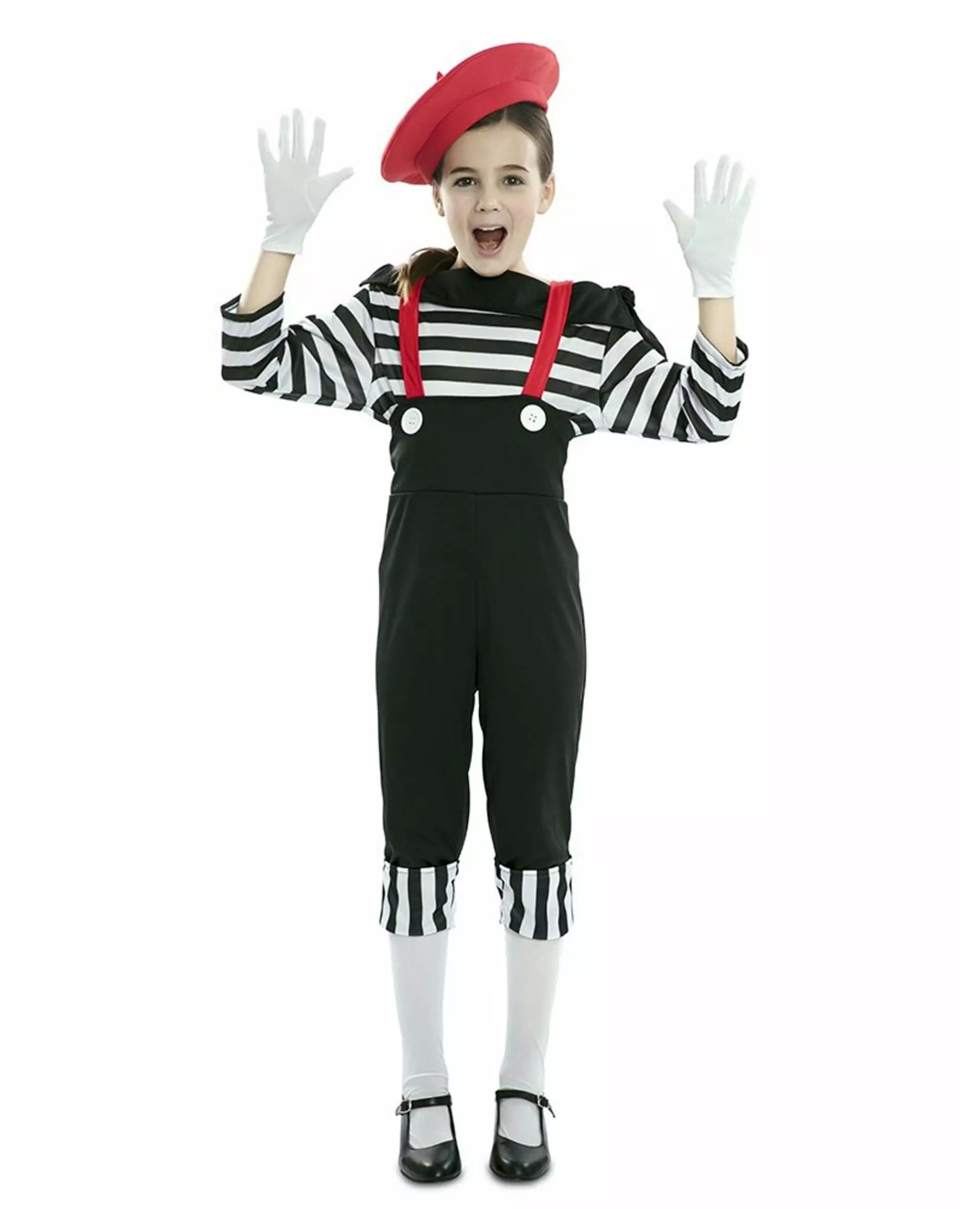Kunsten å gjøre seg forstått uten å snakke! Dette mimekostymet for jenter består av en topp, capribukser med hofteholdere og en beret. Toppen er en langermet t-skjorte med svarte og hvite horisontale striper. Kragen faller over skuldrene. Den er helt svart. Capribuksene har høy midje. De er svarte. Oppbrett med svarte og hvite horisontale striper er på underbenene. Røde hofteholdere er sydd til capribuksene. Bereten har brede kanter og er rød. Den er perfekt for å fullføre dette kostymet. Dette mimekostymet i bukser for jenter vil være perfekt for en humoristisk temafest. Inkludert tilbehør: Topp Bukser med hofteholdere Beret Materiale: 100 % polyester Vedlikehold: Håndvask