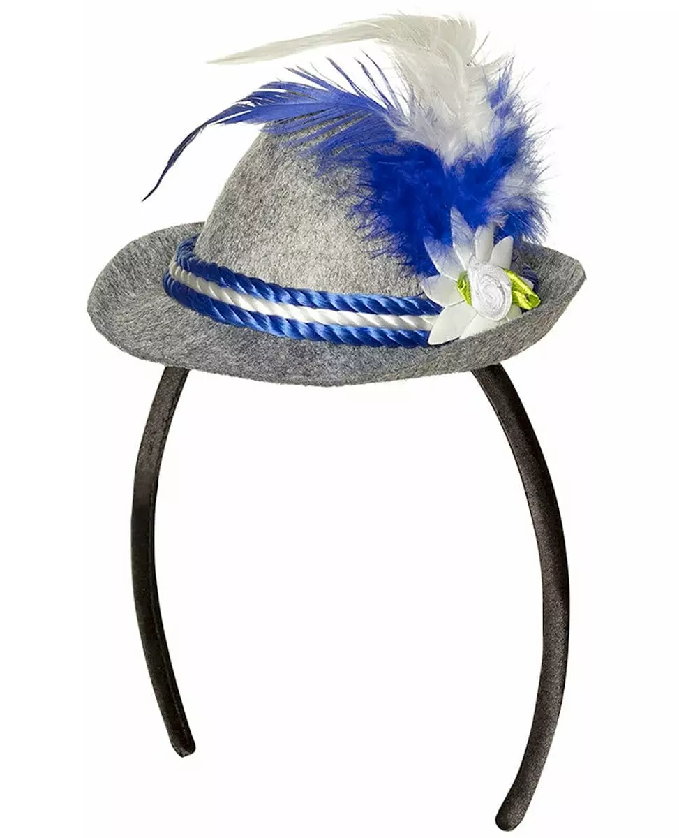 Spesiell Oktoberfest! Denne mini bayerske hatten sitter på et svart pannebånd. Du kan bruke den på hvilken side du vil. Denne mini grå hatten har blå og hvite fjær med en liten hvit blomst på siden. Denne minihatten vil være ideell for å feire den berømte Oktoberfesten med venner!