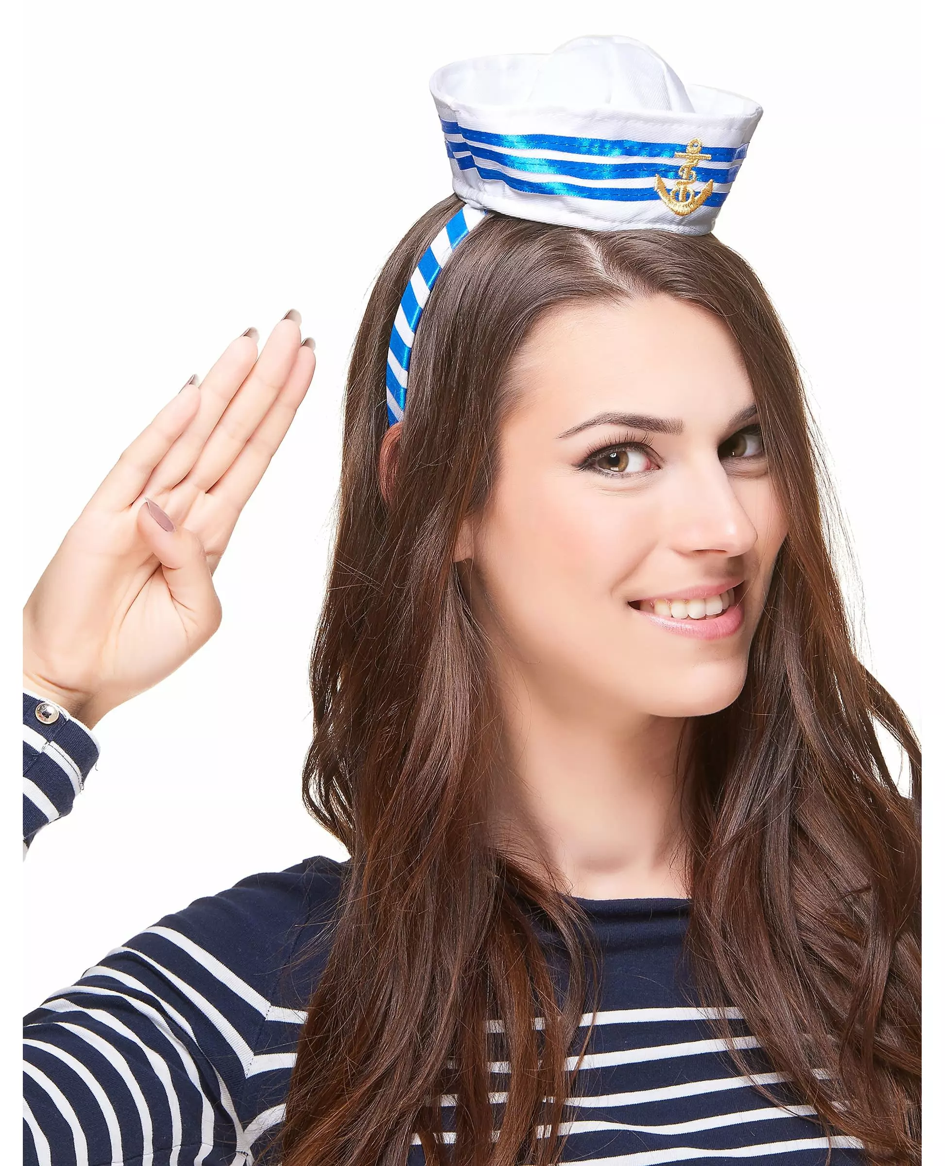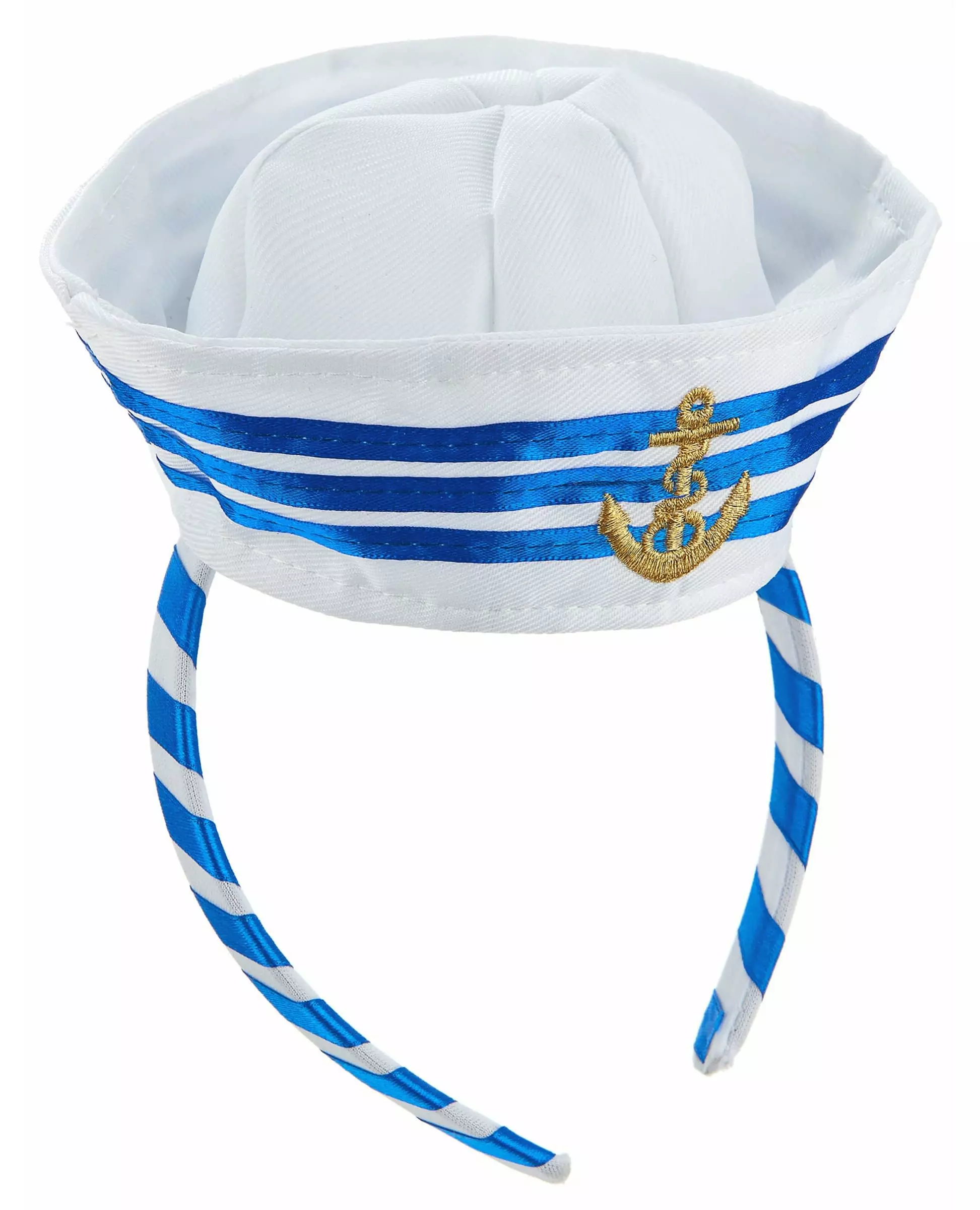 Velkommen sjømenn! Dette pannebåndet er stripete i hvitt og satengblått. På toppen er det festet en sjømannslue. Det er laget av stivt hvitt stoff med tre linjer med satengblått stoff. Et gyllent anker er brodert. For å fullføre et sjømannskostyme, vil dette pannebåndet være hodeplagget du trenger til et kostymearrangement!. Inkludert tilbehør: Pannebånd