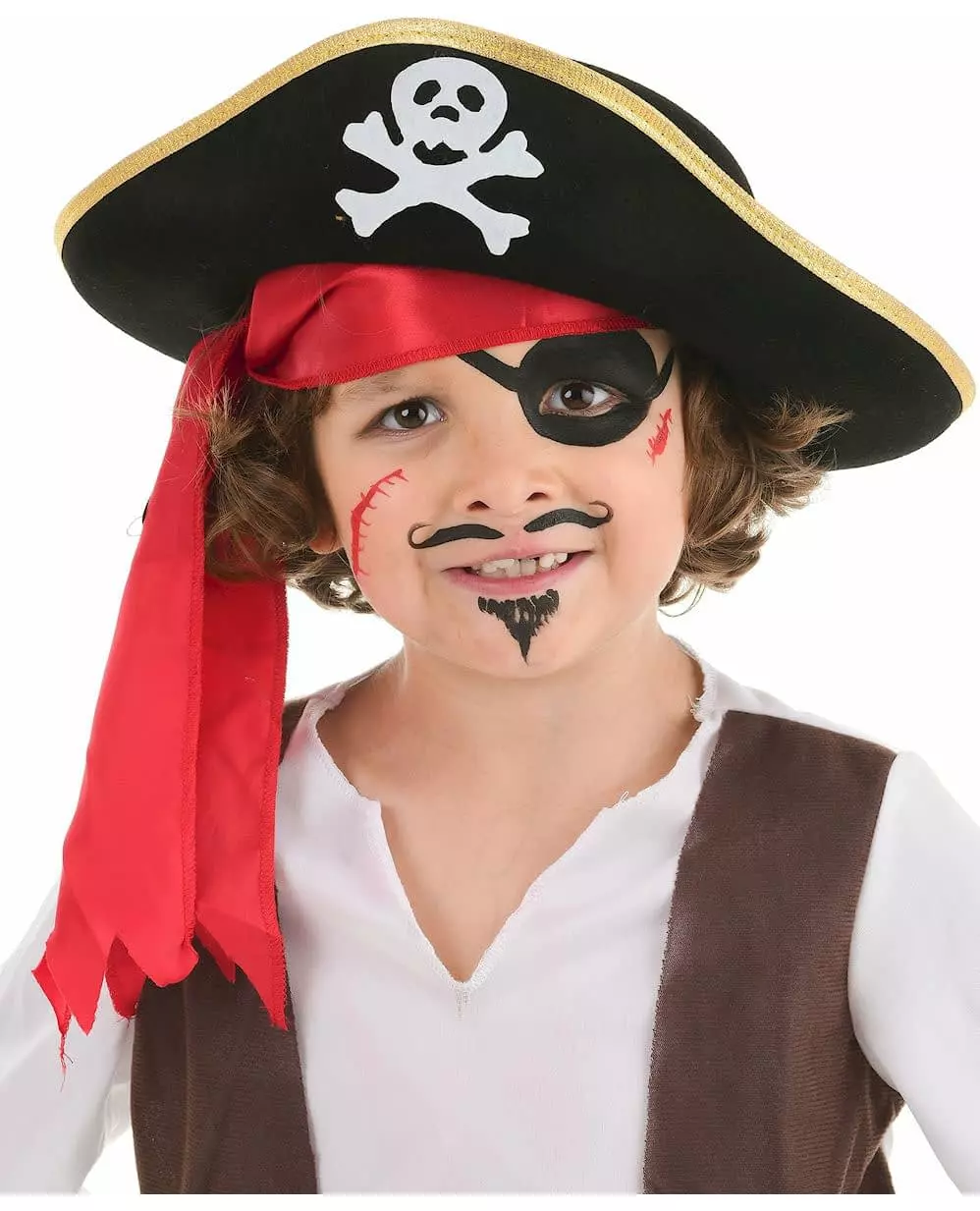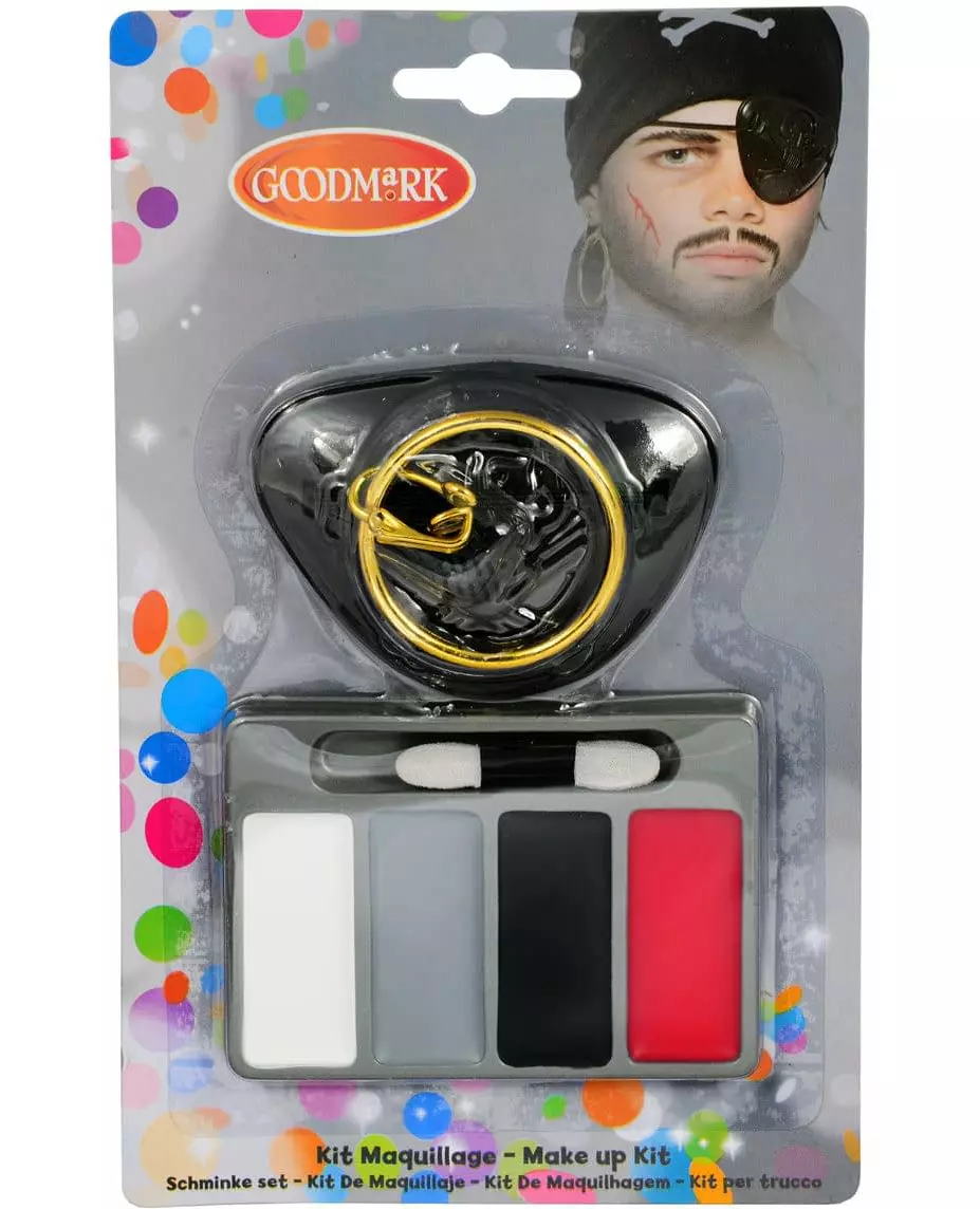 Komplett! Dette piratsminkesettet inkluderer en firefargers palett, en applikatorbørste, en øyelapp og en ørering. Fargene er hvit, grå, svart og rød. De kan påføres med den lille applikatorbørsten og fjernes med såpe og vann. Til slutt fullfører en øyelapp og en klips-ørering settet. Øyelappen kan holdes på ansiktet med en strikk. Dette settet vil være perfekt for å fullføre piratkostymet ditt under karneval eller andre utkledningsarrangementer. Inkludert tilbehør: 1 palett med 4 farger 1 applikatorbørste 1 øyelapp 1 ørering