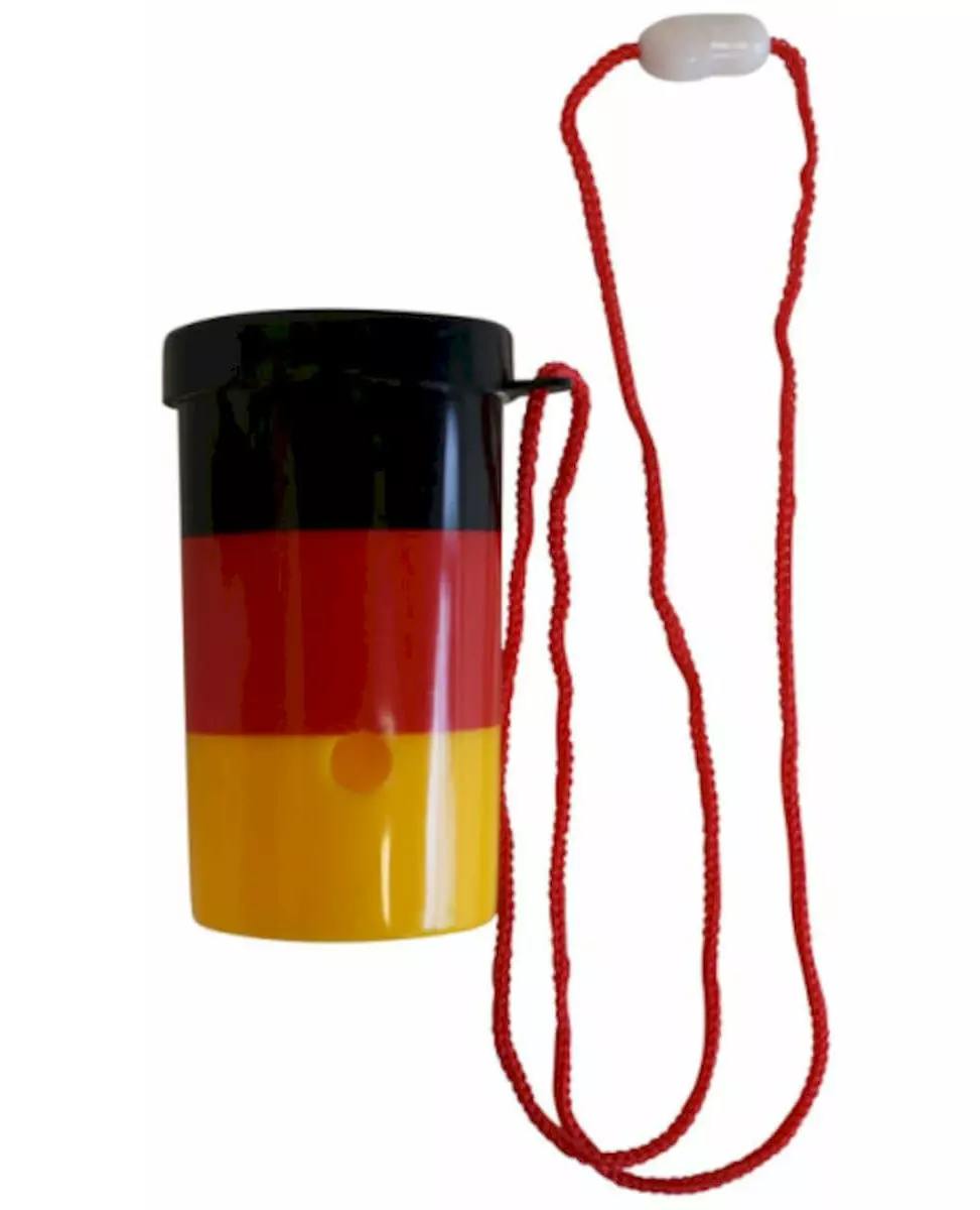Ideelt for å støtte favorittlaget ditt! Dette tåkeluret er i fargene til det tyske flagget. Det er svart, rødt og gult. En rød snor lar deg enkelt bære det lille tåkeluret rundt halsen! Dette tilbehøret vil være perfekt for å støtte favorittlaget ditt under en fotballturnering eller til andre utkledningsanledninger! Inkludert tilbehør: 1 Halskjede Materiale: Plast Stell: Ikke vask