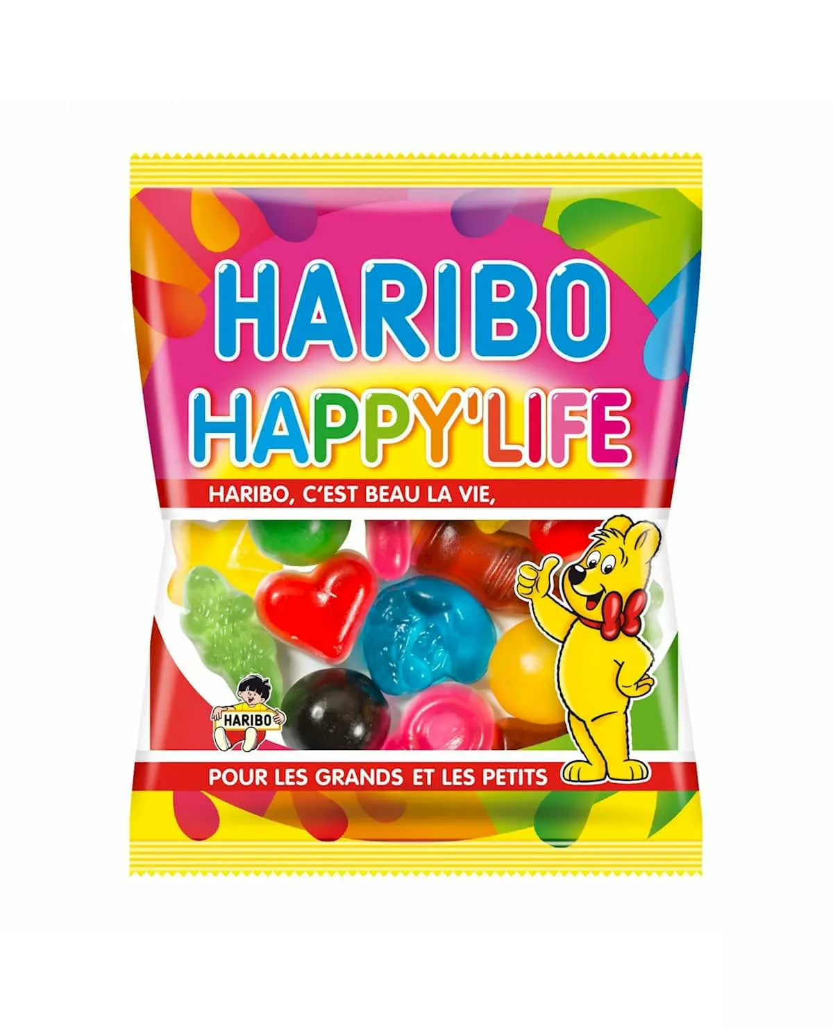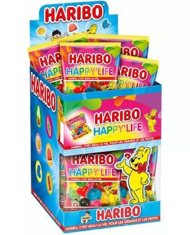 Tilfør festen et lite snev av sødme med disse Haribo-godteriene! Denne lille posen med Happy'Life-godteri fra det kjente Haribo-merket inneholder 40 g godteri og måler omtrent 10 x 10 cm. Gi et snev av generøsitet ved å skjemme bort venner og familie med disse deilige Haribo-godteriene på en temafest eller til en bursdag! Ingredienser: Glukosesirup; sukker; dekstrose; gelatin; stivelse; surhetsregulerende midler: sitronsyre, eplesyre; aroma; konsentrerte fruktjuicer: eple, appelsin, sitron, jordbær, bringebær, ananas; frukt- og plantekonsentrater: saflor, spirulina, eple, kiwi, hyllebær, appelsin, solbær, aronia, sitron, drue, mango, pasjonsfrukt; hyllebærekstrakt; invertsukkersirup; karamellsirup; surhetsregulerende midler: mononatriumcitrat, natriumsyremalat; fargestoffer: curcumin, patentblått V, vegetabilsk trekull, vegetabilske karotener, lutein, antocyaniner; belegningsmidler: hvit og gul bivoks, karnaubavoks. Oppbevares unna varme og fuktighet. Kan inneholde spor av hvete og melk. Ingredienser: glukosesirup; sukker; gelatin; dekstrose; surhetsregulerende midler: sitronsyre, eplesyre; belegningsmiddel: karnaubavoks; surhetsregulerende midler: kalsiumsitrater, natriummalater; aroma; frukt- og plantekonsentrater: eple, kiwi, spinat, nesle; johannesbrødkjeksekstrakt; invertsukkersirup; fargestoff: karminer. Per 100 g eller 100 ml: Energi 1 kJ / 1 kcal Fett hvorav: - Mettede fettsyrer 1 g 1 g Karbohydrat hvorav: - Sukkerarter 1 g 1 g Protein 1 g Salt 1 g. Inkludert tilbehør: 1 minipose