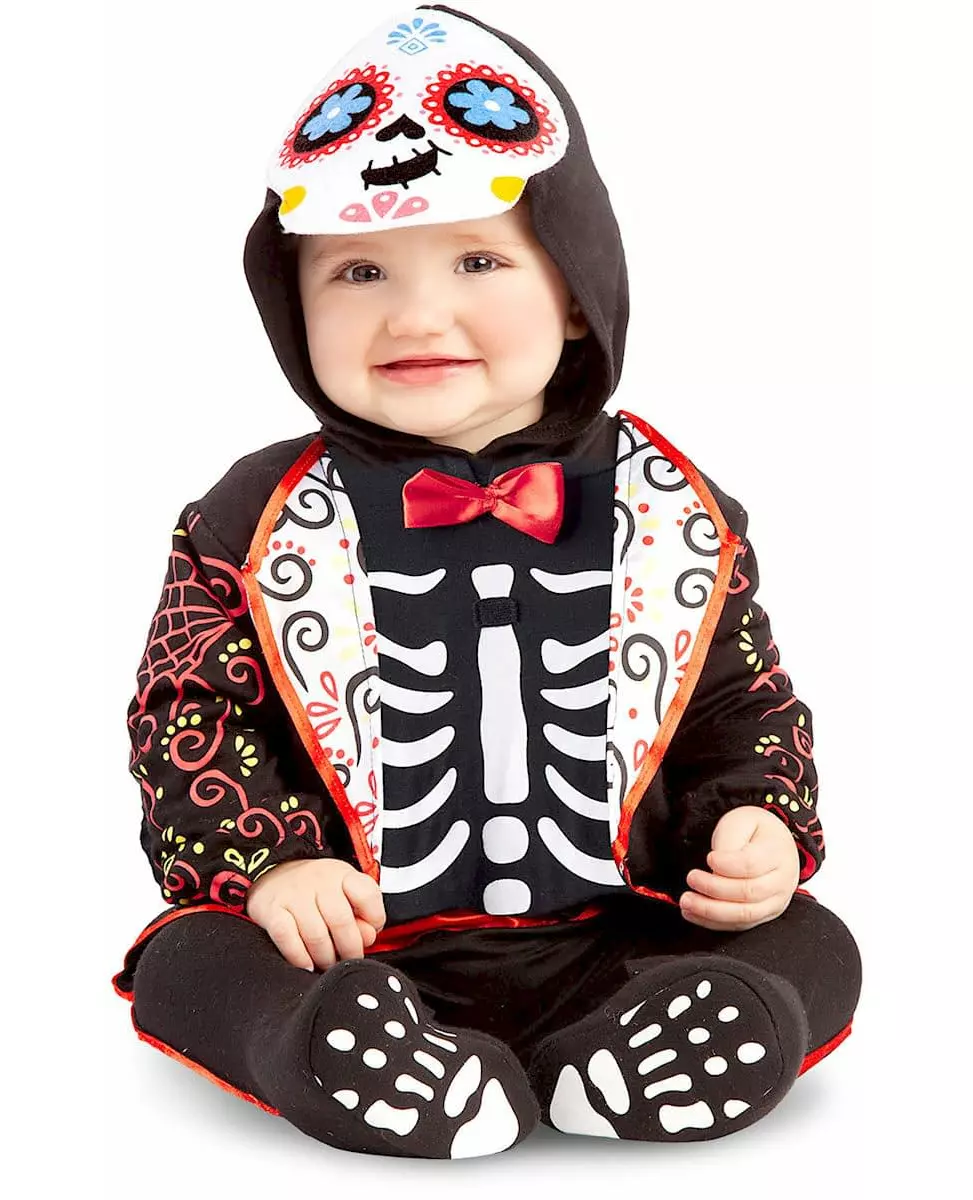 Halloween blir festlig med dette fargerike babykostymet. Dette Dia de los Muertos-skjelettkostymet for babyer består av en jumpsuit. Denne er svart med fargerike blomstermønstre. I midten er det trykket et skjelettmønster. Forsiden av en jakke er sydd på kostymet. Hetten er svart med en fargerik hodeskalle sydd på. Nederdelen av føttene er trykket med skjelettføtter. Dette kostymet vil være perfekt for å la babyen delta på Halloween-festen. Inkludert tilbehør: Jumpsuit Materiale: 100 % polyester Stell: Håndvask