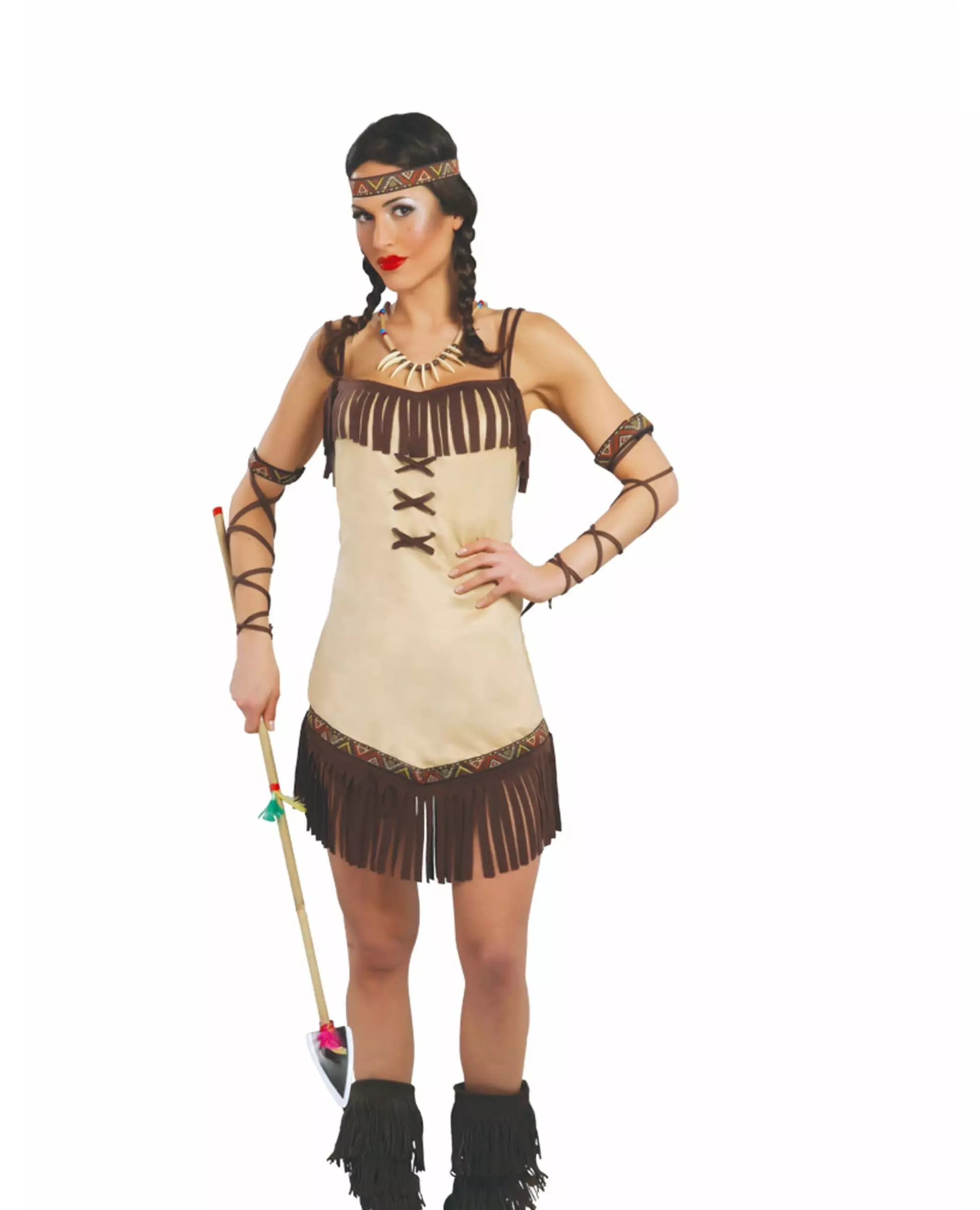 Stammehøvding! Dette Miwok-indianerkostymet består av en kjole og et pannebånd (sko, halskjede, spyd og mansjetter er ikke inkludert). Den ermeløse beige kjolen er dekorert med brune frynser i halsen og bunnen. Antrekket leveres med et pannebånd med et indiansk motiv. Dette Miwok-kostymet vil være ideelt for neste karneval eller til en kostymefest med indiansk tema. Inkludert tilbehør: Kjolepannebånd Materiale: 100 % polyester Stell: Håndvask