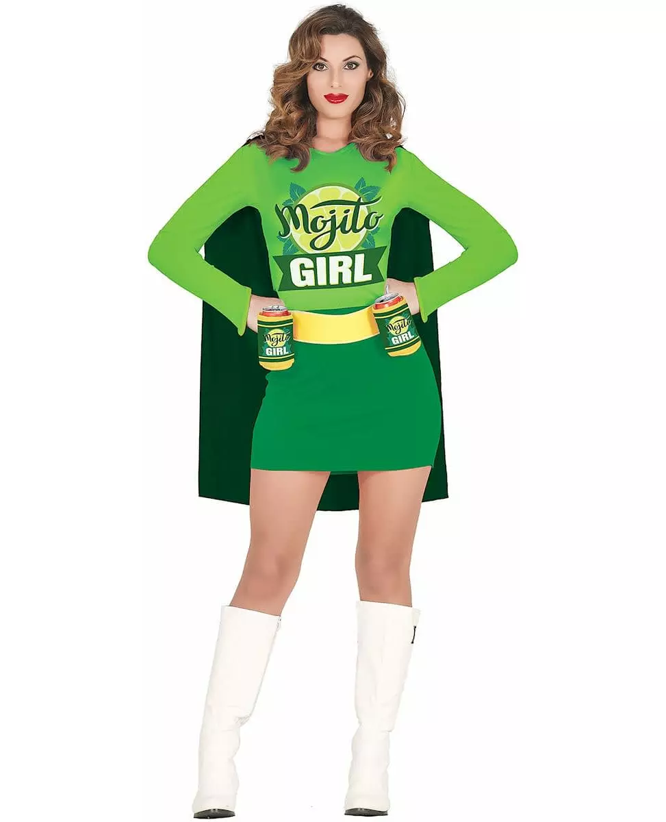 Festenes superhelt! Dette Mojito-jentekostymet for kvinner består av en tettsittende grønn kjole, en matchende kappe og et koppholderbelte for å holde drinkene dine lett tilgjengelige. Med det morsomme "Mojito-jente"-trykket vil dette originale antrekket gi et snev av friskhet og godt humør til kveldene dine. Den flagrende kappen gir et dynamisk utseende, mens det gule beltet fullfører dette uvanlige og festlige utseendet. Perfekt for et utdrikningslag, dette kostymet vil gjøre deg til barens dronning! Inkludert tilbehør: 1 kjole 1 kappe 1 belte 1 koppholder Materiale: 100 % polyester Vedlikehold: Håndvask