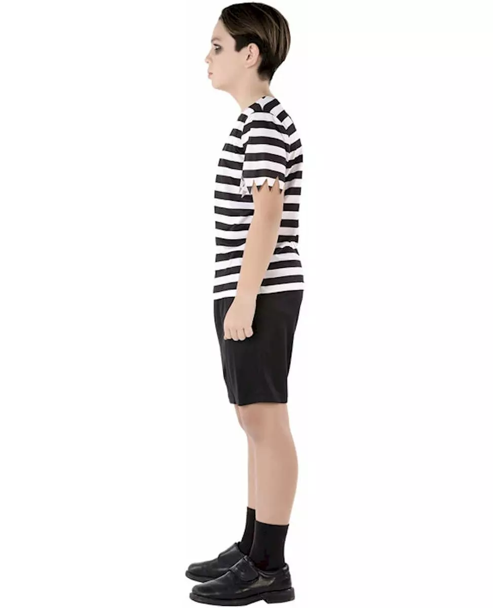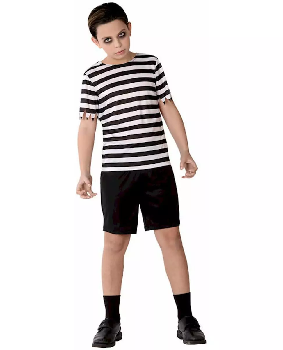 En morbid gutt til Halloween? Dette morbide familiekostymet er for gutter, og består av en t-skjorte og shorts. T-skjorten er hvit med svarte striper. Endene av ermene gir den revne effekten. Shortsen er svart og går til knærne. Dette morbide familiekostymet for gutter vil gjøre en furore på et kostymearrangement eller til Halloween. Inkludert tilbehør: T-skjorte Korte bukser Materiale: 100 % polyester Vedlikehold: Håndvask