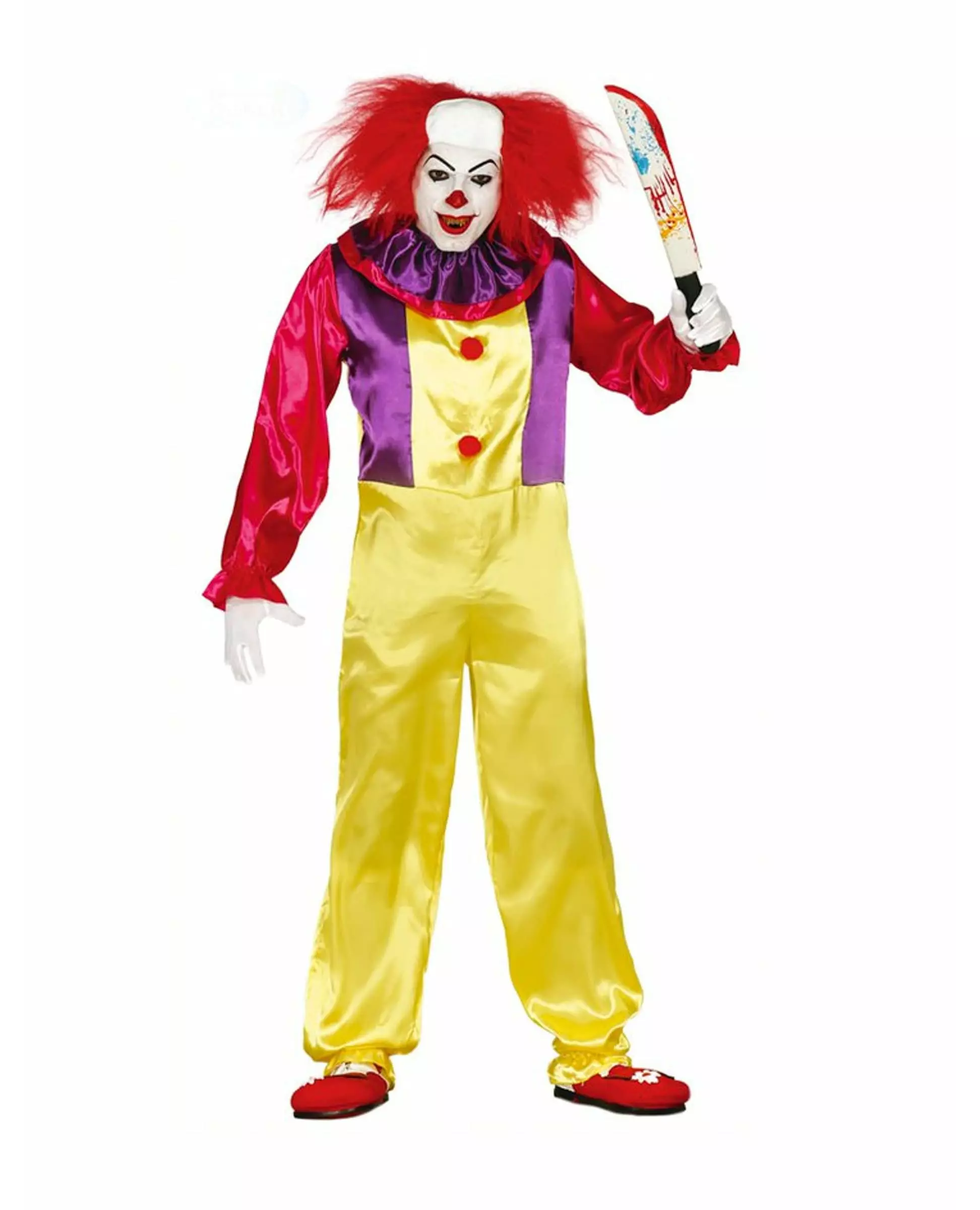 En ond og skremmende klovn! Dette morderklovnkostymet for voksne består av en jumpsuit (hansker, parykk, sko og machete er ikke inkludert). Jumpsuiten er laget av satengstoff. Den har lange ermer. Denne jumpsuiten er for det meste gul, med en lilla krage og en del av bysten og røde ermer. Den er dekorert med to røde pomponger ved bysten. Den har også en krage som er typisk for klovneantrekk. Kledd i dette forferdelige kostymet, vil du forårsake kaldsvette og skrik. Med dette onde klovnekostymet kan du legemliggjøre den berømte onde klovnen fra en skrekkfilm Halloween-anledning. Tilbehør inkludert: Jumpsuit Materiale: Polyester Stell: Håndvask