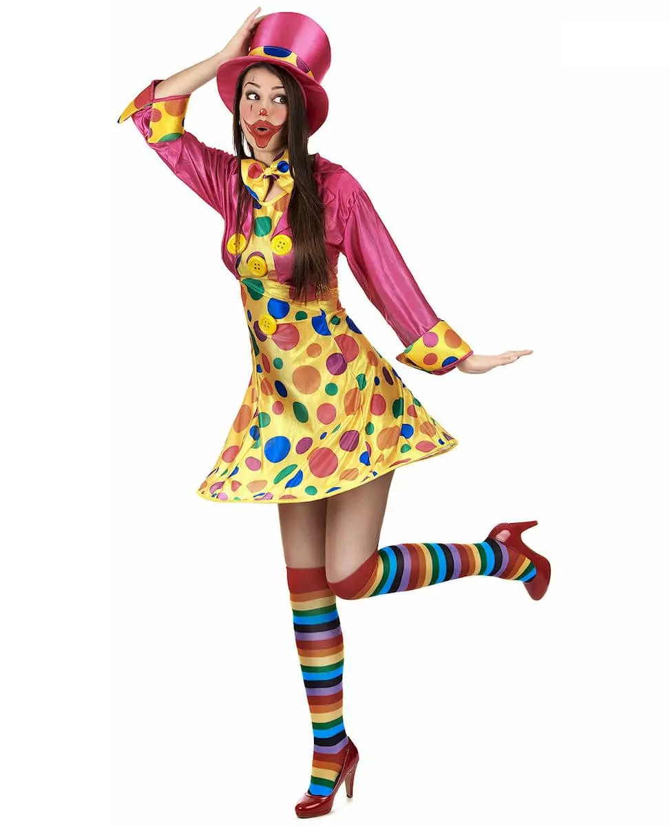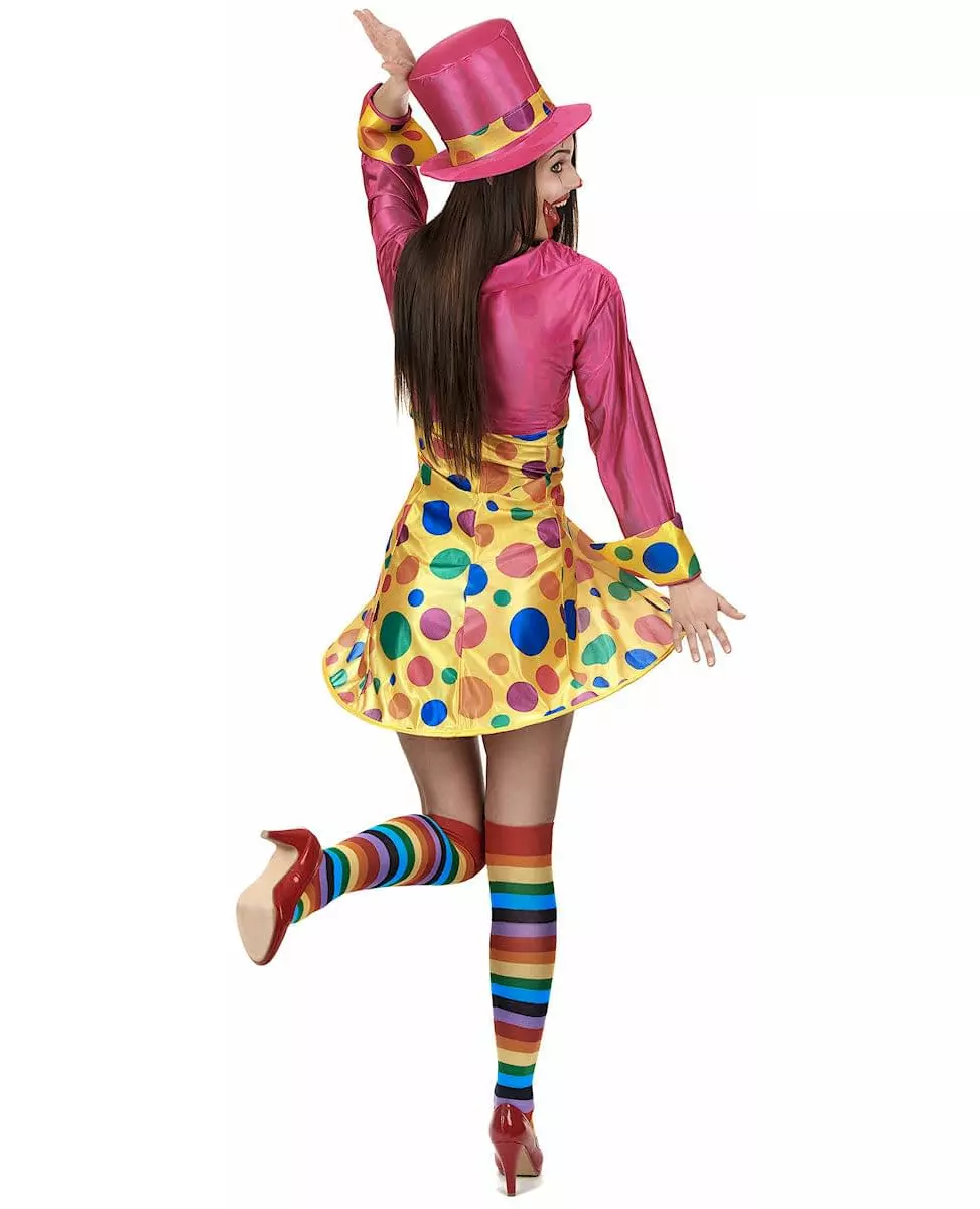 Nydelig 4-delt kostyme! Dette klovnekunstnerkostymet for kvinner består av en kjole, en jakke, en hatt og en sløyfe (sko og strømper er ikke inkludert). Dette klovnekostymet vil være ideelt for å live opp utkledningsfestene dine. Inkludert tilbehør: Kjole Jakke Hatt Sløyfe Materiale: 100 % polyester Vedlikehold: Håndvask