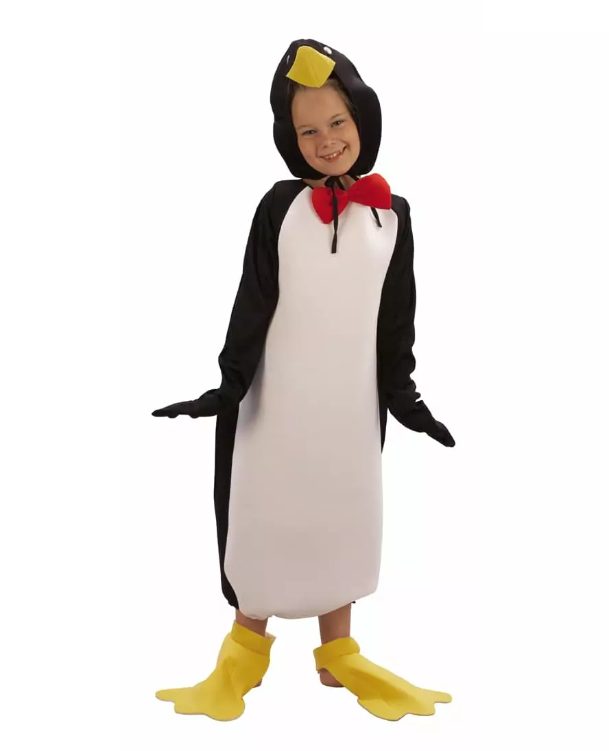 Med morsomme svømmeføtter! Unisex pingvinkostyme for barn som består av en heldekkende drakt med en rød sløyfe foran (forsiden er laget av skum, baksiden er laget av mykt stoff), en pingvinhodehette med borrelås og skoovertrekk formet som morsomme svømmeføtter med strikk for støtte. I ermene er det et hakk ved håndleddene som lar deg ta hendene ut eller la dem ligge inni for et enda mer imponerende utseende! Dette kostymet vil gjøre barnet ditt til en ekte liten pingvin fra topp til tå, og det er ideelt for å kle seg ut på en morsom måte ved forskjellige anledninger. Inkludert tilbehør: Jumpsuit med hette 2 skoovertrekk Materiale: 93,5 % polyester, 6,5 % elastan Målinformasjon: For størrelse 4/6 år, jumpsuit ca. 81 cm lang og 48 cm bred ved brystet