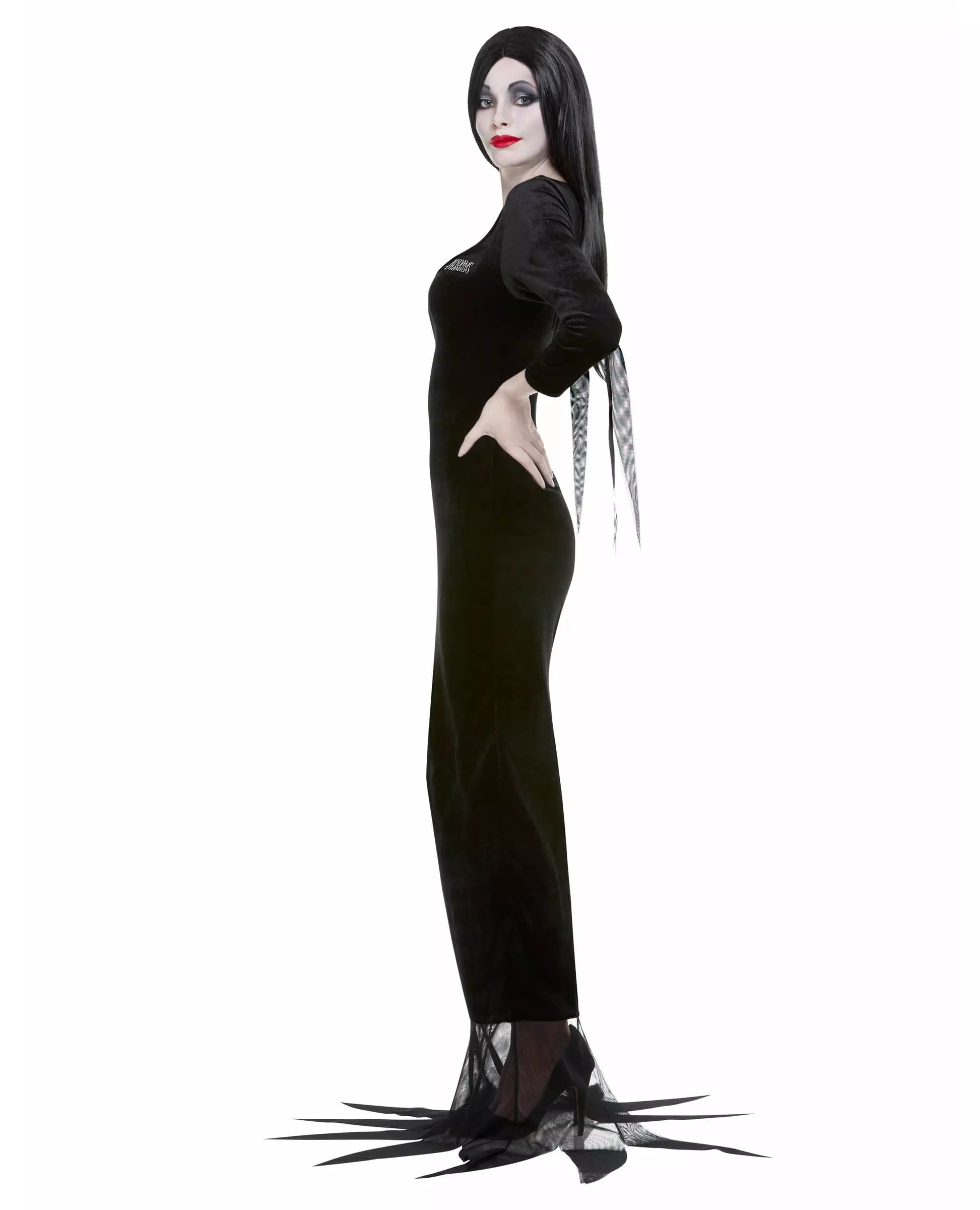 Bli den ondeste bimboen med dette Morticia-kostymet! Dette Morticia-kostymet er offisielt lisensiert av The Addams Family®. Dette kostymet er for kvinner, det inkluderer kjole og parykk (sko og sminke er ikke inkludert). Fløyelskjolen er lang til føttene, små svarte stoffslør henger fra ermene på kjolen. Kjolen er tettsittende og sexy, den vil fremheve kurvene dine. Alt du trenger er den svarte parykken med langt, rett hår for å legemliggjøre den ekte Morticia! Bruk dette Morticia-kostymet til din neste Halloween-fest og ønsk gjestene dine velkommen til ditt uhyggelige hjem! Materiale: POLY (100,0 %). Inkludert tilbehør: Parykk. Stell: Håndvask.