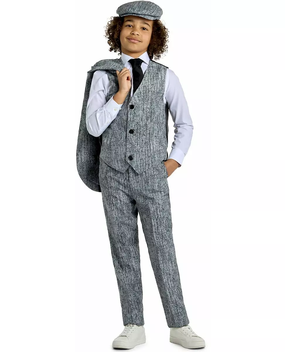 en gangsters sko! Dette gangsterkostymet fra 1920-tallet er for barn. Offisielt lisensiert av Suitmeister™ består det av en jakke, bukser, vest og slips. Dressen er grå. Jakken har to falske sidelommer og lukkes med knapper foran. Den er dekorert med knapper på baksiden av hvert erme. Vesten matcher jakken og har også to knapper foran. Buksene har samme farge som jakken. Den har to sidelommer og lukkes med glidelås og knapp. Det svarte slipset fullfører kostymet og knytes enkelt rundt halsen. Dette gangsterkostymet vil være perfekt for å forkle barnet ditt til en fest med 20-tallstema! Materiale: 100 % polyester. Inkludert tilbehør: Jakke Bukser Vest Slips Stell: Håndvask