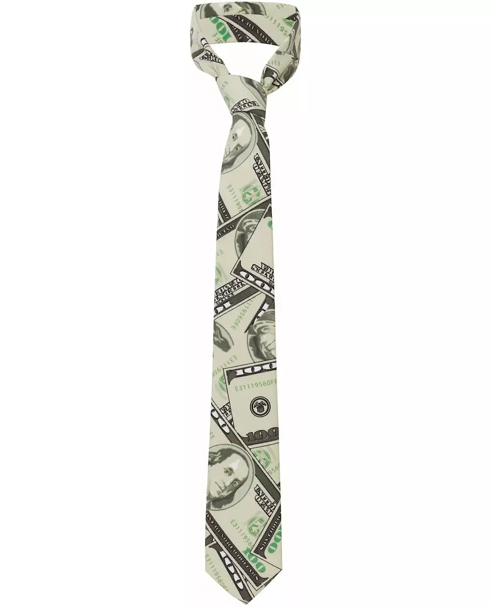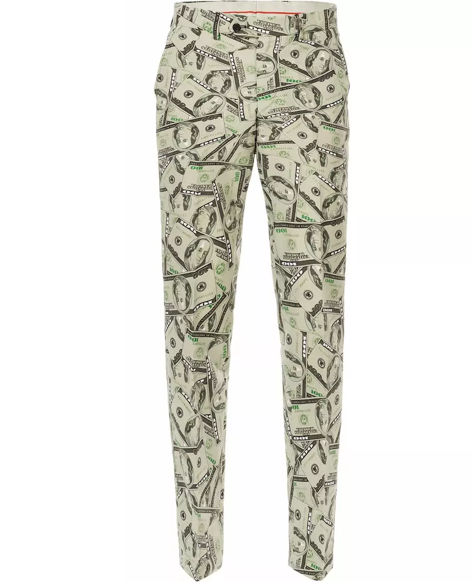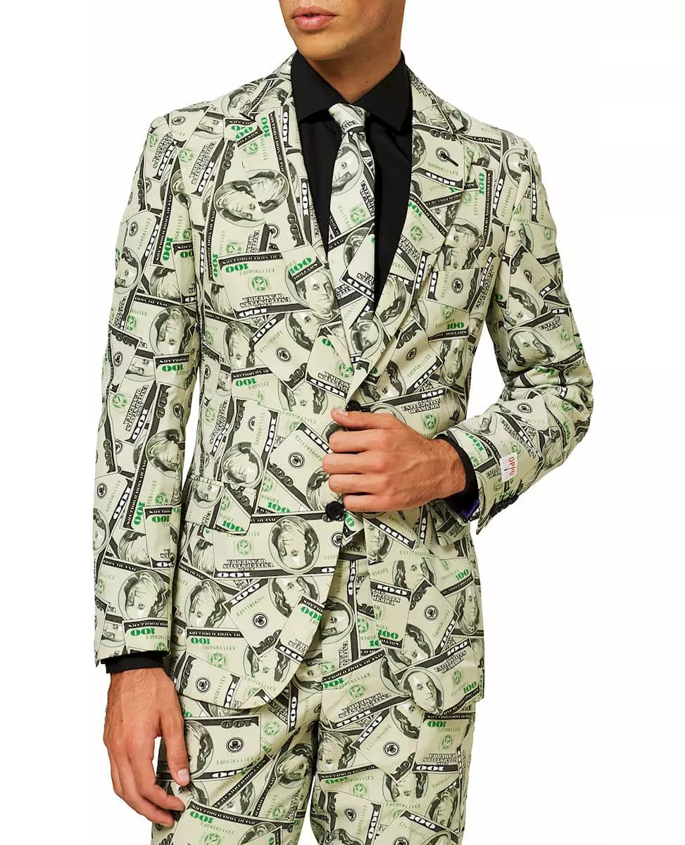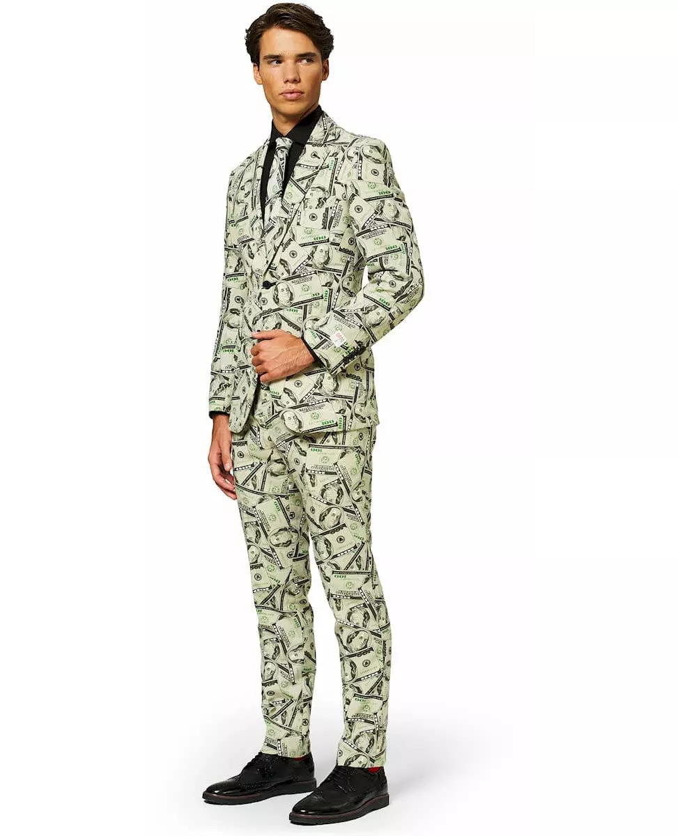 Kunne du ikke motstå fristelsen til å vinne? Denne herredressen fra Mr. Cashanova er fra Opposuits™. Den består av en jakke, bukser og slips (skjorte og sko er ikke inkludert). Denne dressen av høy kvalitet har et trykt 100-dollarseddel. Jakken lukkes foran med to knapper. Den har et slips som kan knytes rundt halsen. Buksene har lommer både foran og bak. De lukkes enkelt med glidelås. Dette gangsterkostymet vil være perfekt for å vise frem din gode smak til alle på et utkledningsfest. Inkludert tilbehør: Jakke Bukser Slips Materiale: 100 % polyester Vedlikehold: Håndvask