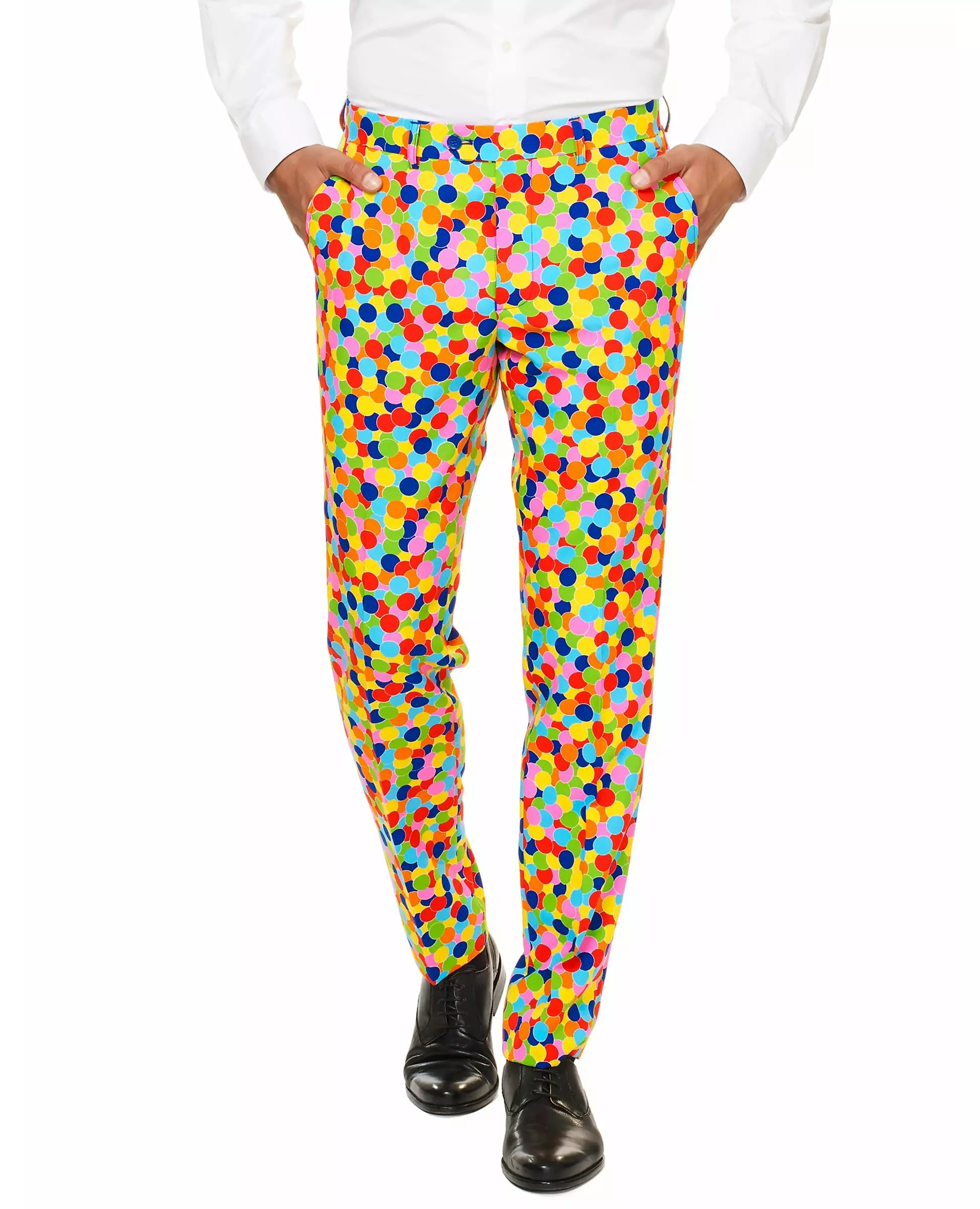 Hvis jeg er kledd som konfetti ... er jeg en konfetti?! Denne offisielt lisensierte Opposuits™ Mr. Confetteroni herredressen består av en jakke, slips og bukse, trykt med polkadotter i alle farger (skjorte og sko er ikke inkludert). Den perfekt tilpassede jakken er dekorert med to falske lommer foran og lukkes med to blå knapper. De plisserte buksene har to sidelommer og lukkes med glidelås og en knapp. Slipsen knytes rundt halsen og setter prikken over i-en på dressen. Med dette uvanlige kostymet som ser ut som det er laget av konfetti, vil du være elegant og original under alle omstendigheter. Inkludert tilbehør: Jakke Bukser Slips Materiale: 100 % polyester