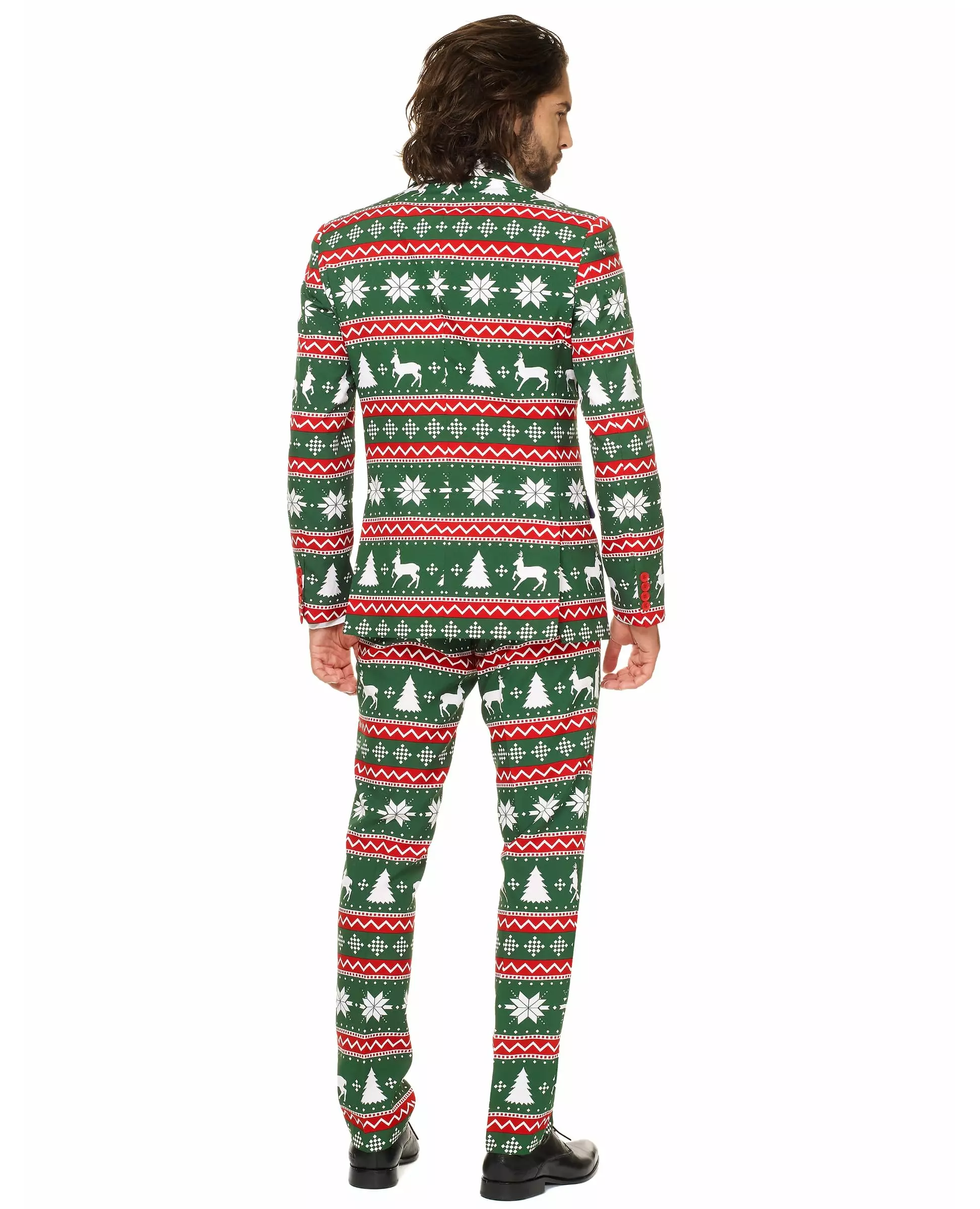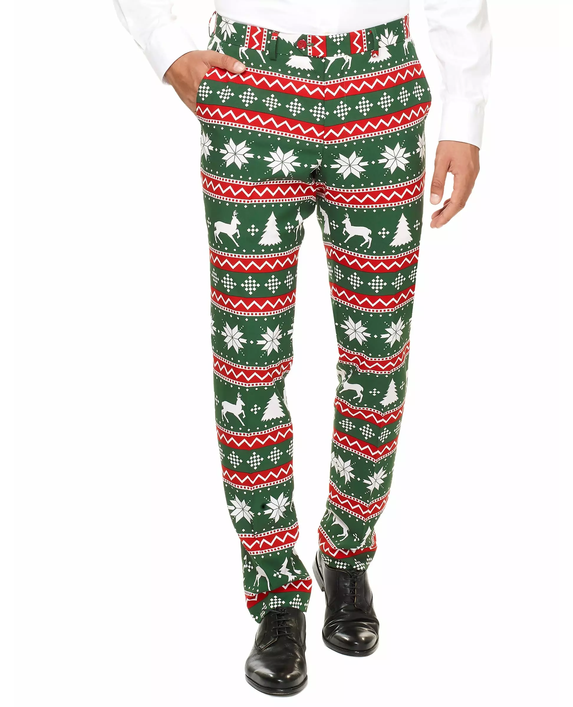juletema med klasse! Denne Mr Festive-juledressen fra Opposuits er for menn. Den består av en jakke, bukse og slips (skjorte og sko er ikke inkludert). Denne 3-delte dressen er laget av stoff av god kvalitet, grønne og røde striper med hvite julemønstre som reinsdyr, grantrær eller snøflak. Dressjakken lukkes med 2 knapper og har 2 falske lommer på sidene. Buksene har 2 lommer foran og 2 lommer bak. Baklommene lukkes med knapper. Disse buksene har også beltehemper hvis du ønsker å bruke belte. De lukkes med en knapp, en krok og en glidelås. Slipsen knytes enkelt rundt halsen. Dette komplette kostymet vil være perfekt for å imponere vennene dine om kvelden under avslutningsfestene!. Inkludert tilbehør: Jakke Bukser Slips Materiale: 100 % polyester Vedlikehold: Håndvask