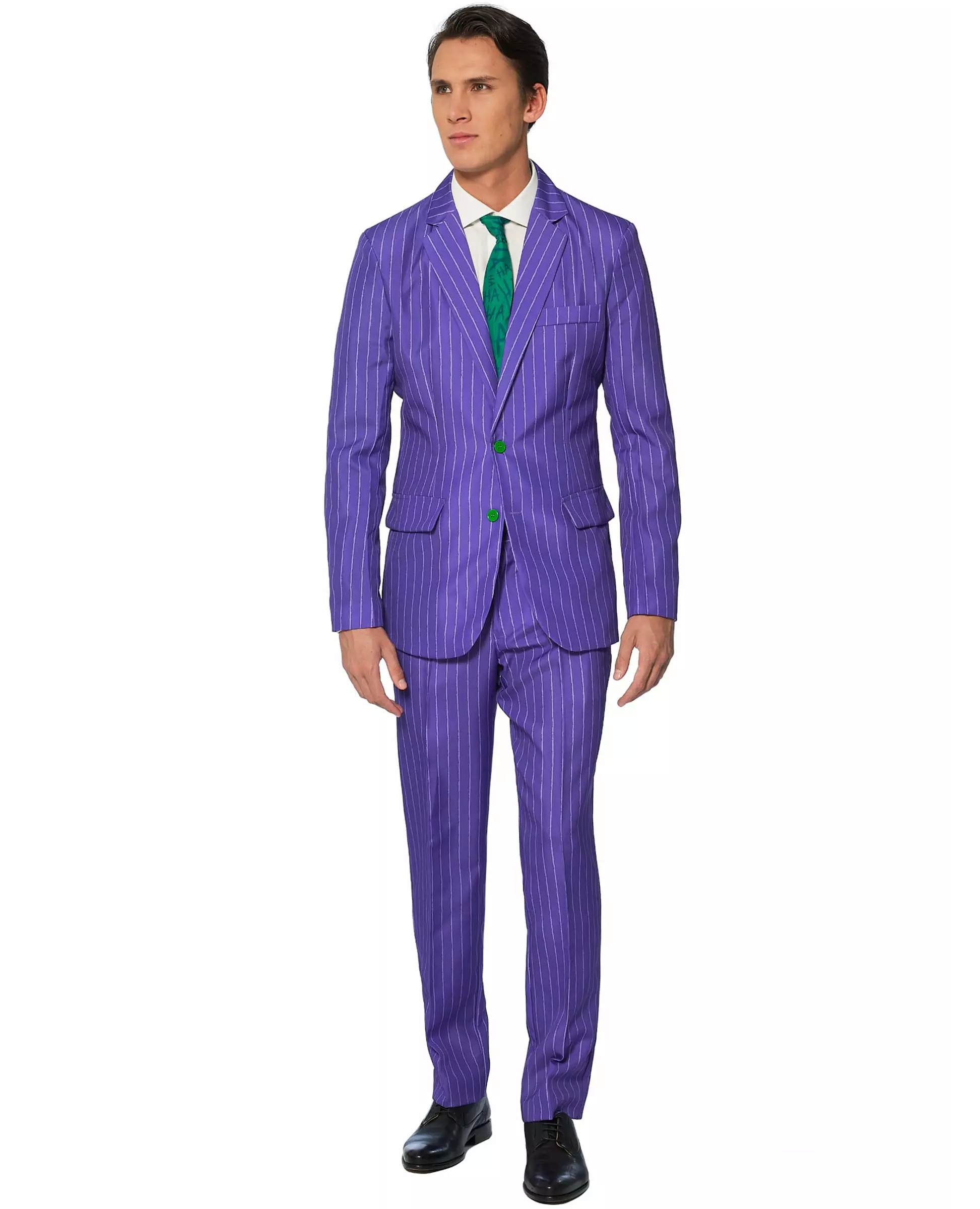 Få frem ondskapen! Dette Mr. Joker™-kostymet er offisielt lisensiert av Suitmeister™. Dette kostymet for voksne inkluderer en jakke, bukser og slips. Overdelen er en lilla dressjakke med tynne hvite striper som minner om Jokerens kostyme i Batman™-filmene. Du finner en brystlomme og to falske sidelommer, jakken lukkes med to grønne plastknapper. Buksene matcher jakken, samme mønster og farge. Den lukkes med glidelås og en knapp og har to sidelommer. Slipset er grønt med ordet "HA" i mørkegrønt over hele slipset. Det knytes rundt halsen for å fullføre dette elegante antrekket. Dette Mr. Joker™-kostymet vil være ideelt for en kostymefest med superskurktema eller til og med DC Comics-universet! Inkludert tilbehør: Bukser Jakke Slips Materiale: Polyester Stell: Håndvask