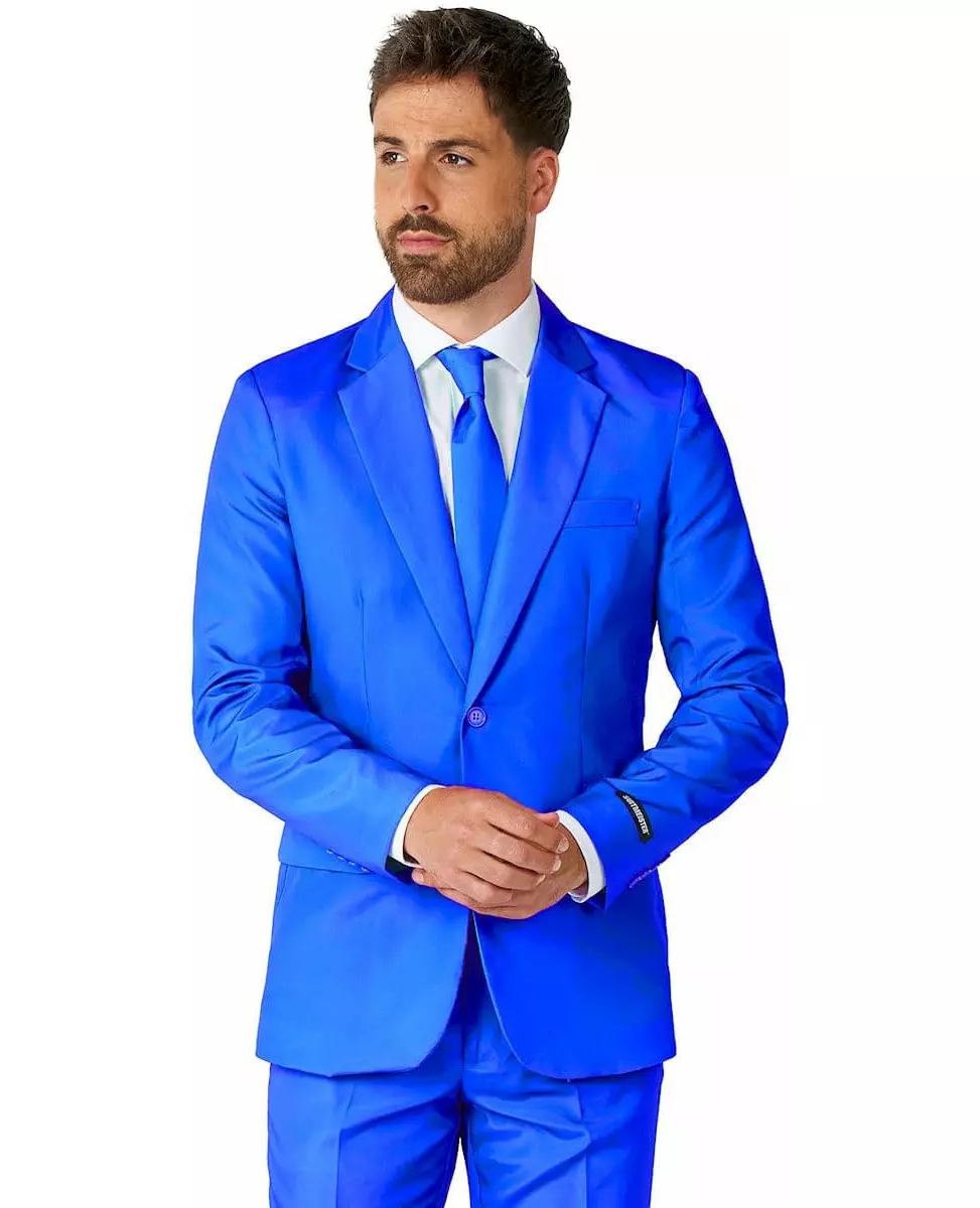 Bli den mest stilige på festen Denne blå Suitmeister™-dressen for menn består av en jakke, bukse og slips. Hele dressen er laget av et kvalitetsblått stoff. Jakken har to falske lommer på sidene og lukkes med knapper. Buksene har også lommer foran og lukkes med en knapp og glidelås. Til slutt knytes slipset enkelt rundt halsen. Denne blå dressen vil være perfekt for å få deg til å skille deg ut på din neste kostymefest. Inkludert tilbehør: Jakke Bukser Slips Materiale: 100 % polyester Vedlikehold: Håndvask