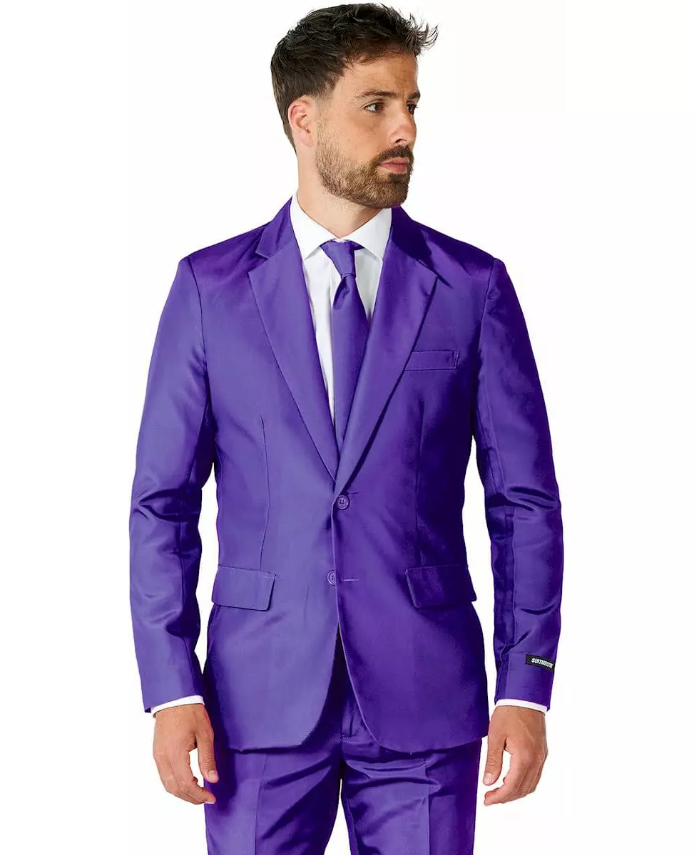 Få frem din naturlige klasse Denne lilla Suitmeister™ herredressen består av jakke, bukse og slips. Hele dressen er laget av lilla stoff av høy kvalitet. Jakken har fuskelommer på sidene og lukkes foran med knapper. De matchende buksene har elastisk midje og hekte- og glidelåslukking foran. Den har lommer foran. Det lilla slipset knytes enkelt rundt halsen. Denne lilla dressen vil være perfekt for å se elegant ut under alle omstendigheter. Inkludert tilbehør: Jakke Bukser Slips Materiale: 100 % polyester Pleie: Håndvask