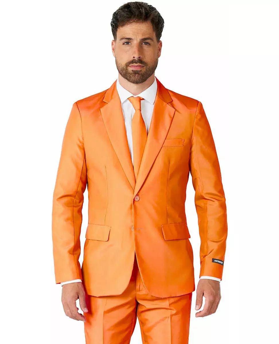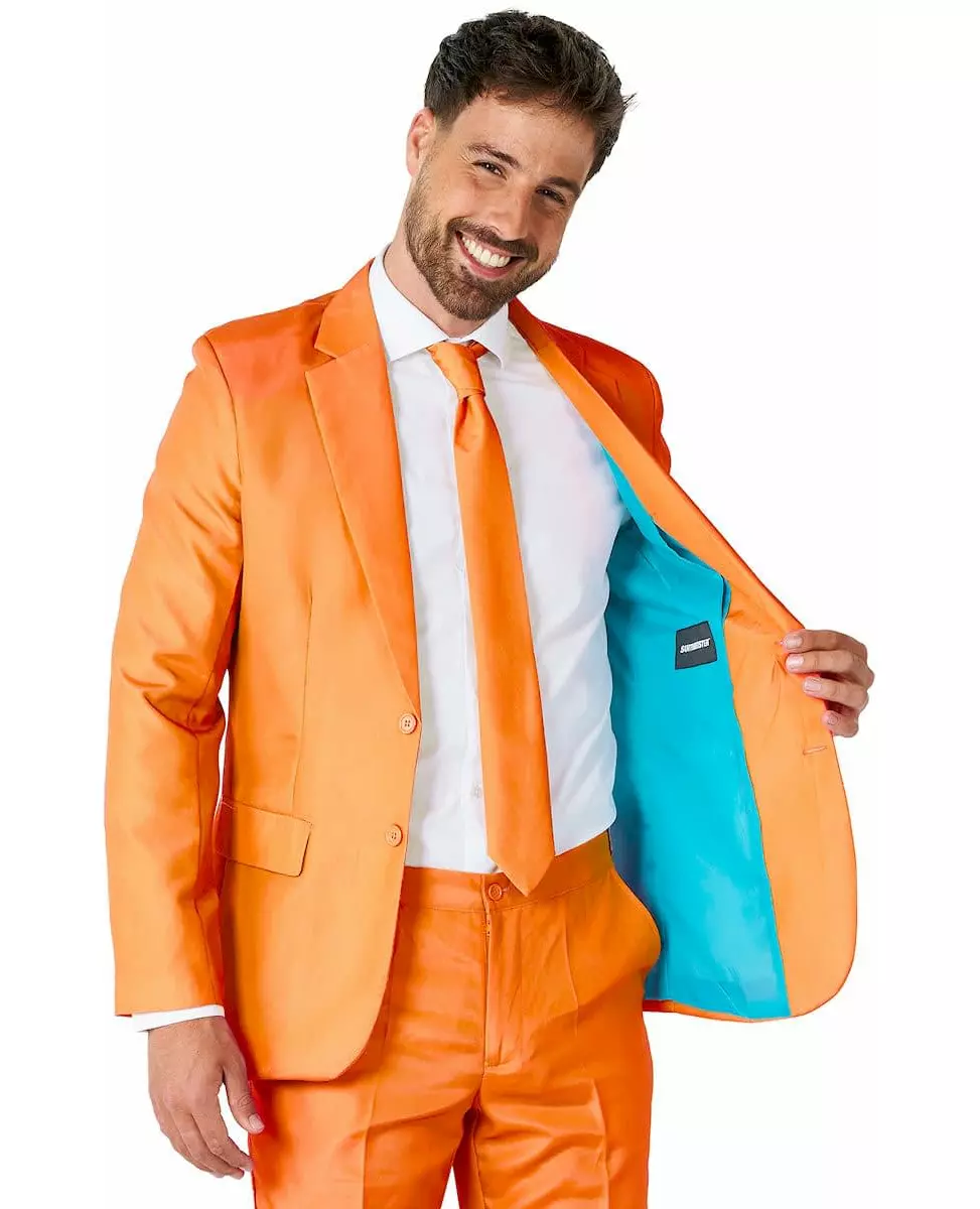 Sørg for at du alltid er på topp med denne Suitmeister. Denne oransje Suitmeister™-dressen for menn består av jakke, bukse og slips. Hele dressen er laget av oransje kvalitetsstoff. Jakken har to falske lommer på sidene og lukkes med knapper. De matchende buksene har lommer foran og lukkes med knapp og glidelås. Slipsen knytes enkelt rundt halsen. Denne oransje dressen vil garantert avsløre din naturlige klasse!. Inkludert tilbehør: Jakke Bukser Slips Materiale: 100 % polyester Pleie: Håndvask