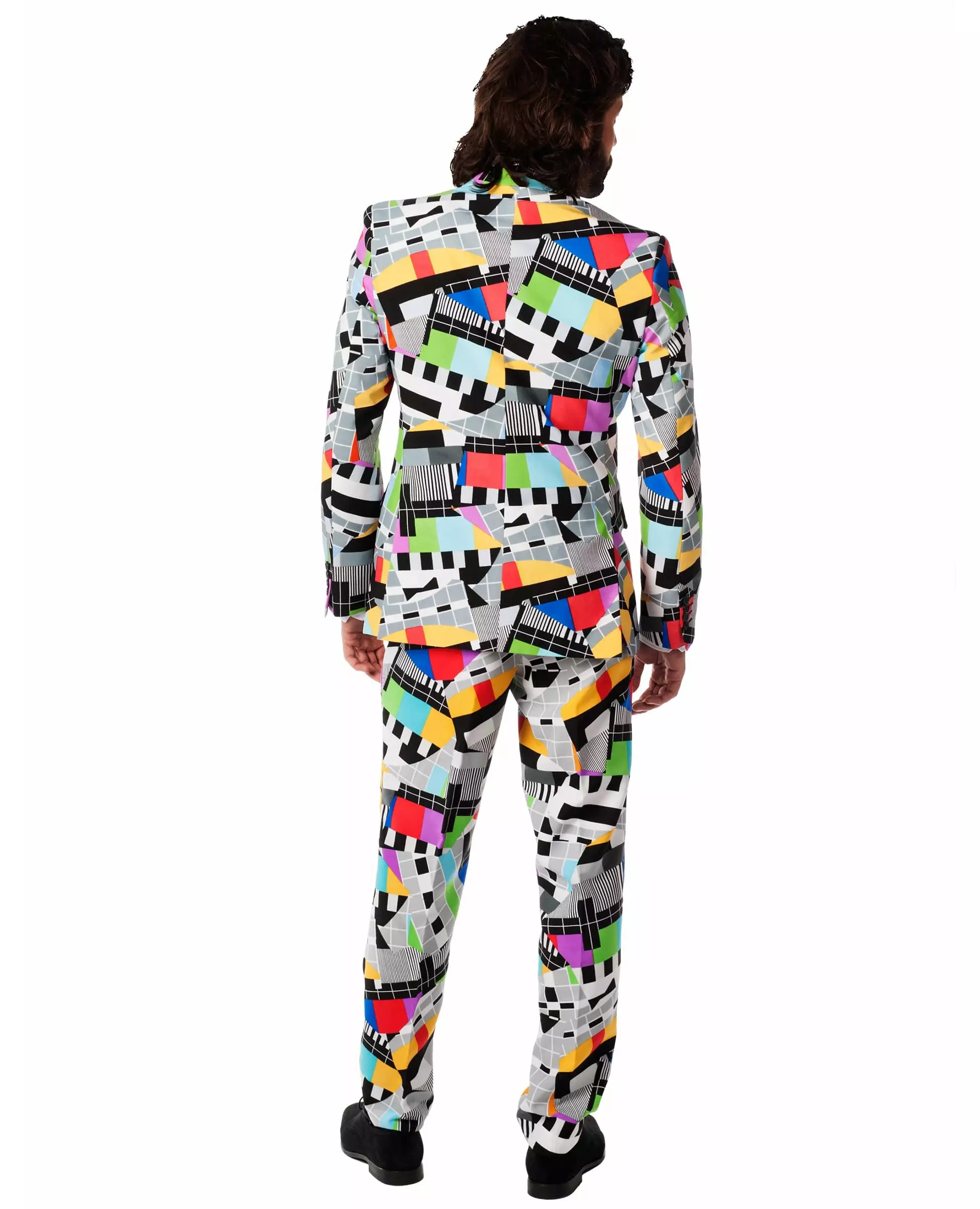 Tilbake til fortiden! Denne fargerike herredressen fra Opposuits™ består av jakke, bukse og slips (skjorte og sko er ikke inkludert). Settet av høy kvalitet er trykt med et mønster som representerer testskjemaet. Jakken er fôret, de rettskårne buksene lukkes med glidelås, og slipset knytes rundt halsen. Dette settet vil være perfekt for en retro-cocktailfest, en TV-kveld eller et utkledningsarrangement. Inkludert tilbehør: Jakke Bukser Slips Materiale: 100 % polyester Vedlikehold: Håndvask