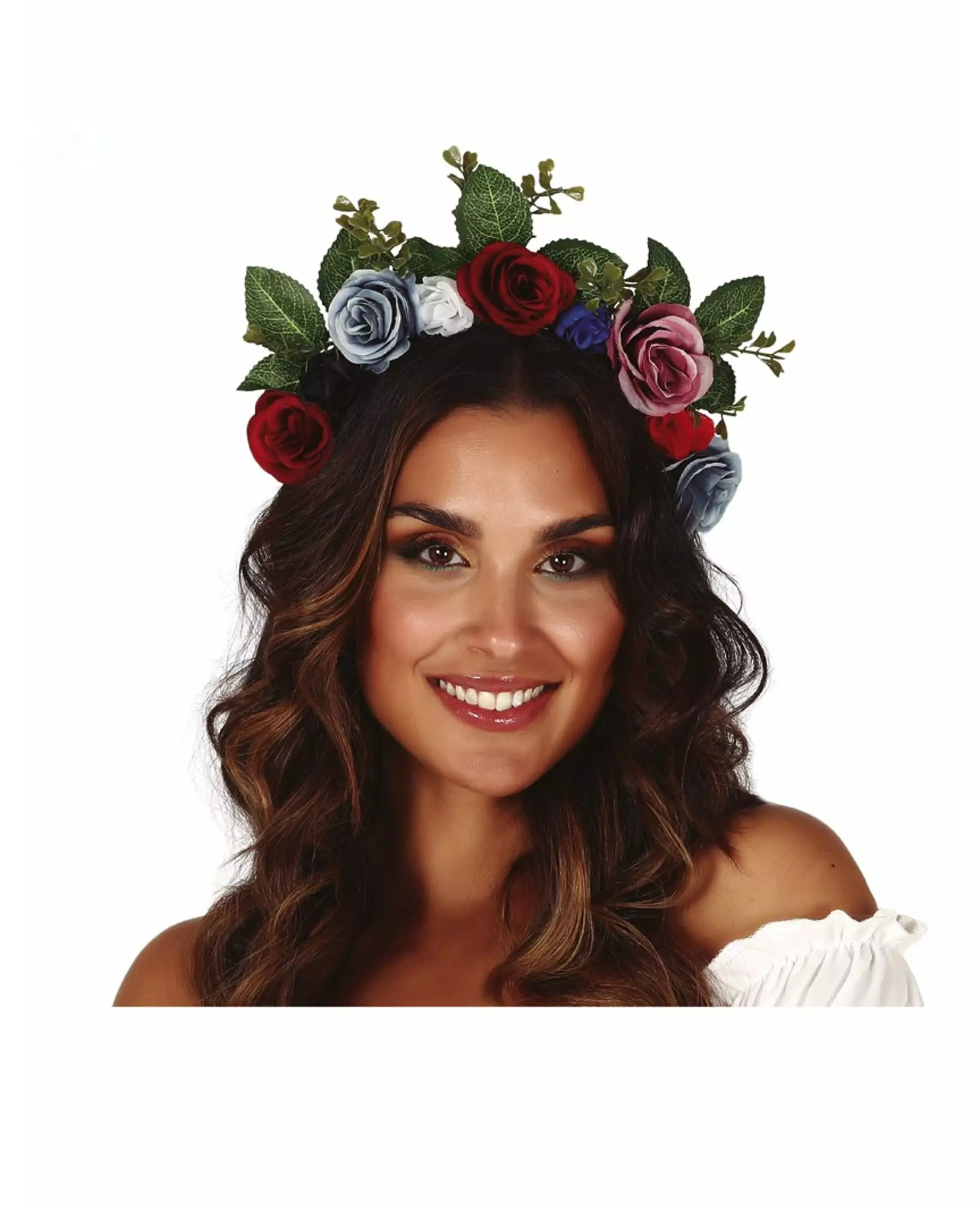 Pynt opp håret med disse fine blomstene til en kostymefest. Denne blomsterkronen for voksne er dekorert med syntetiske blomster. De representerer roser i forskjellige farger: rød, rosa, blå, hvit... Det finnes også blader på den øvre delen. Dette tilbehøret vil være ideelt for å fullføre et hippiekostyme eller et med temaet De dødes dag. Inkludert tilbehør: Pannebånd