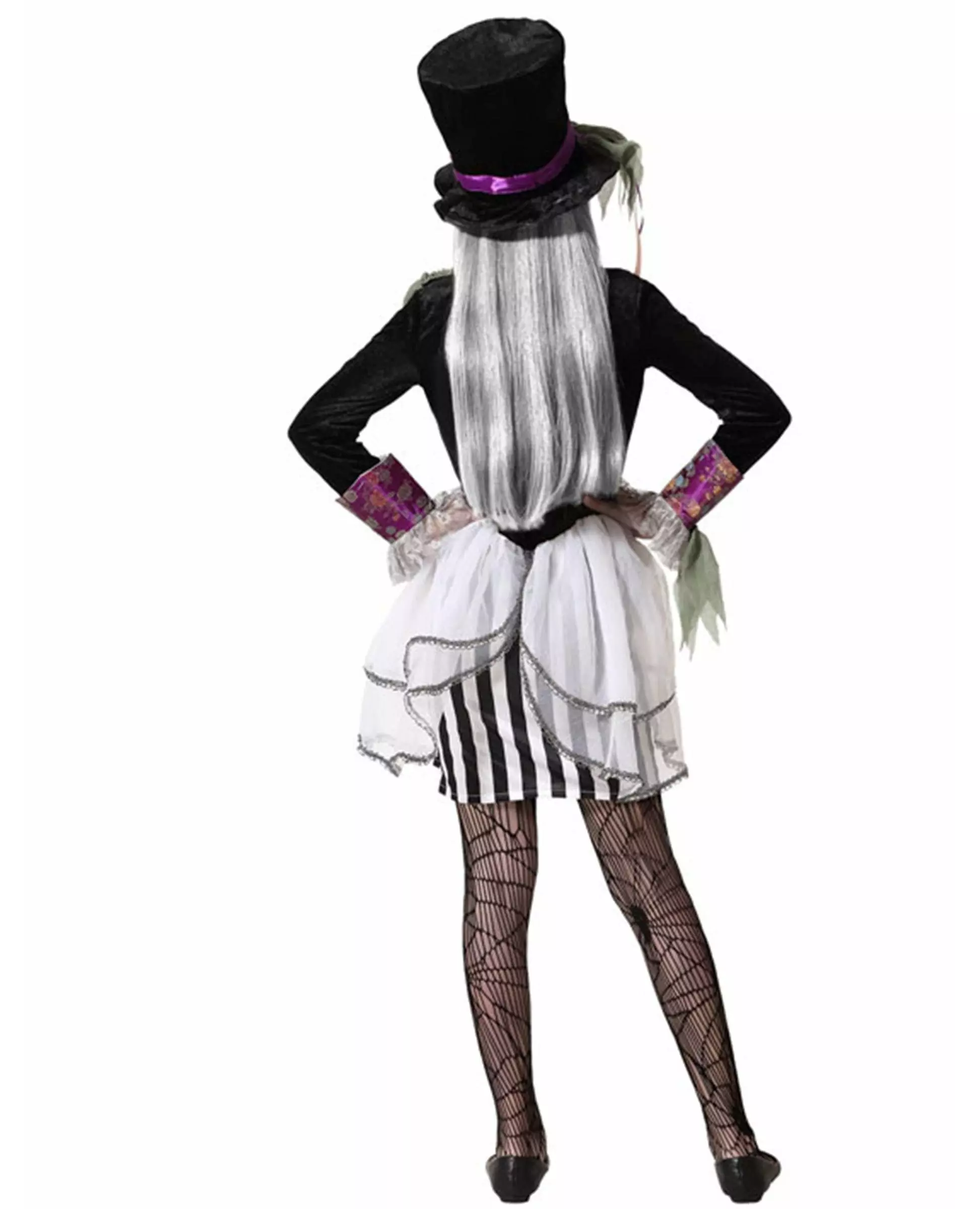 Tre inn i Alices verden i denne mørke versjonen av Den gale hattemaker-kostymet. Dette mørke hattemaker-kostymet for jenter består av en kjole og en hatt (kopp, strømpebukser og sko er ikke inkludert). Hattemakerkjolen imiterer en svart jakke åpen over en grå topp. Slagslagene er lilla. Nederdelen av kjolen har svarte og hvite striper. Den er toppet med et grått slør. Hatten er en svart flosshatt. Den er dekorert nederst med et lilla pannebånd. Dette komplette kostymet vil være perfekt for å forvandle deg til en begravelsesversjon av Den gale hattemakeren til Halloween. Materiale: polyester. Inkludert tilbehør: Kjole Hatt Stell: Håndvask