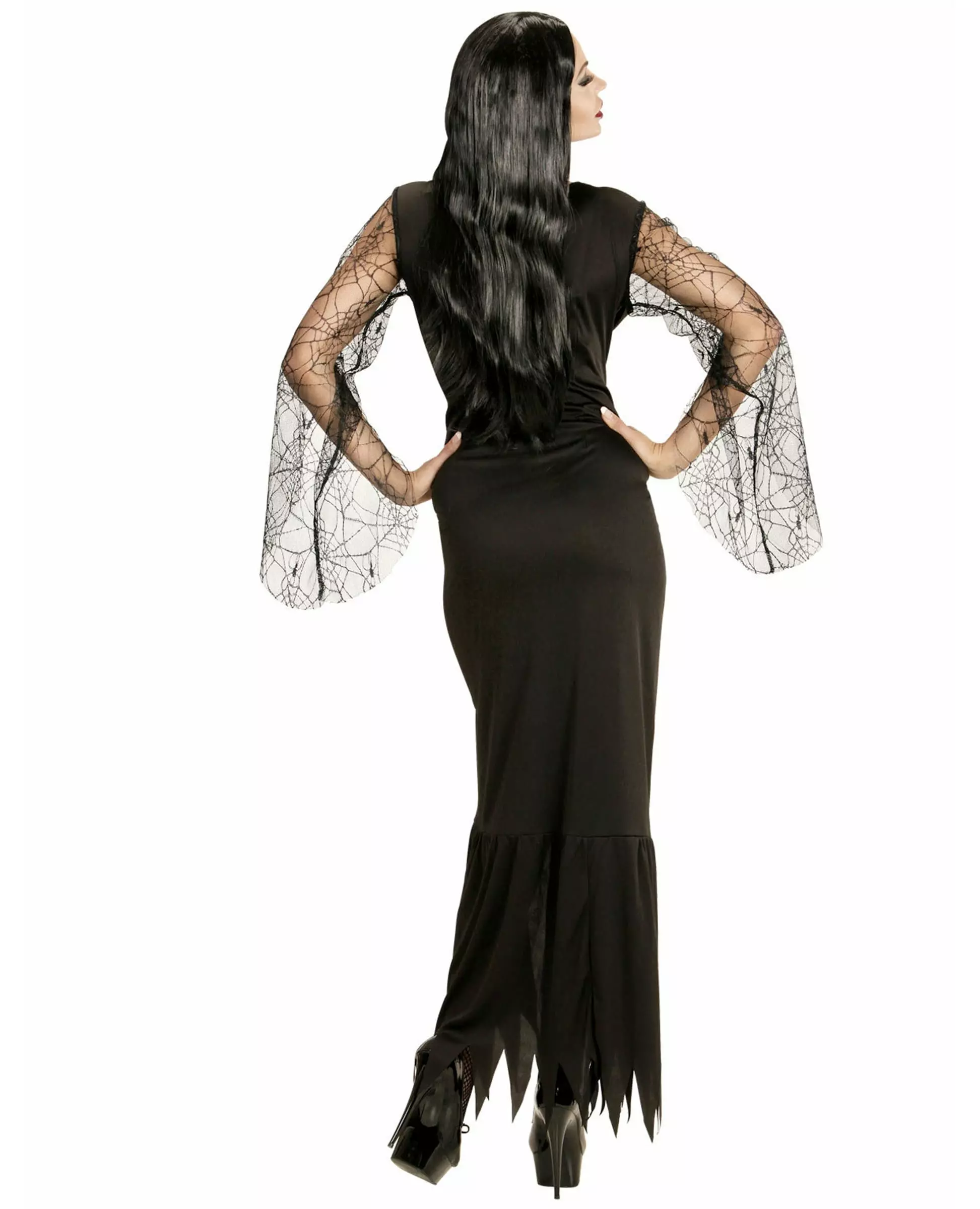 Bli en mørk dame i denne svarte kjolen! Dette mørke dame-kostymet er for kvinner, det inkluderer en kjole. Kjolen er lang, svart, med splitt i bena og en dyp utringning. Ermene er laget av slør med spindelvevmønstre. Kjolen ender i sagtenner. Velg den mørke siden av dette kostymet til Halloween. Inkludert tilbehør: Kjole Materiale: 100 % polyester Pleie: Håndvask